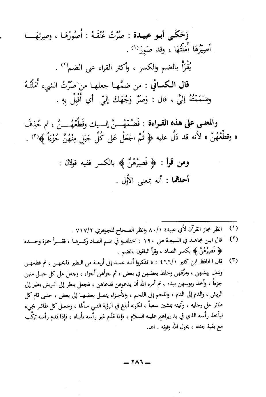 وحكى أبو عبيدة صرت عنقه أصورها عند وصرتها لأنه أصيرها أملتها وقد صور يقرأ بالضم والكسر واكثر القراء على الضم قال الكسائي من ضمها جعلها من صرت الشئ املته وضممته الي قال وصر وجهك الي أبي أقبل به والمعنى على هذه القراءة فضمهن اليك وقطعهن ثم حذف وقطعهن لانه قد دل عليه ثم اجعل على كل جبل منهن جزاءا ومن قرأ فصرهن بالكسر ففيه قولان أحدهما انه بمعنى الاول