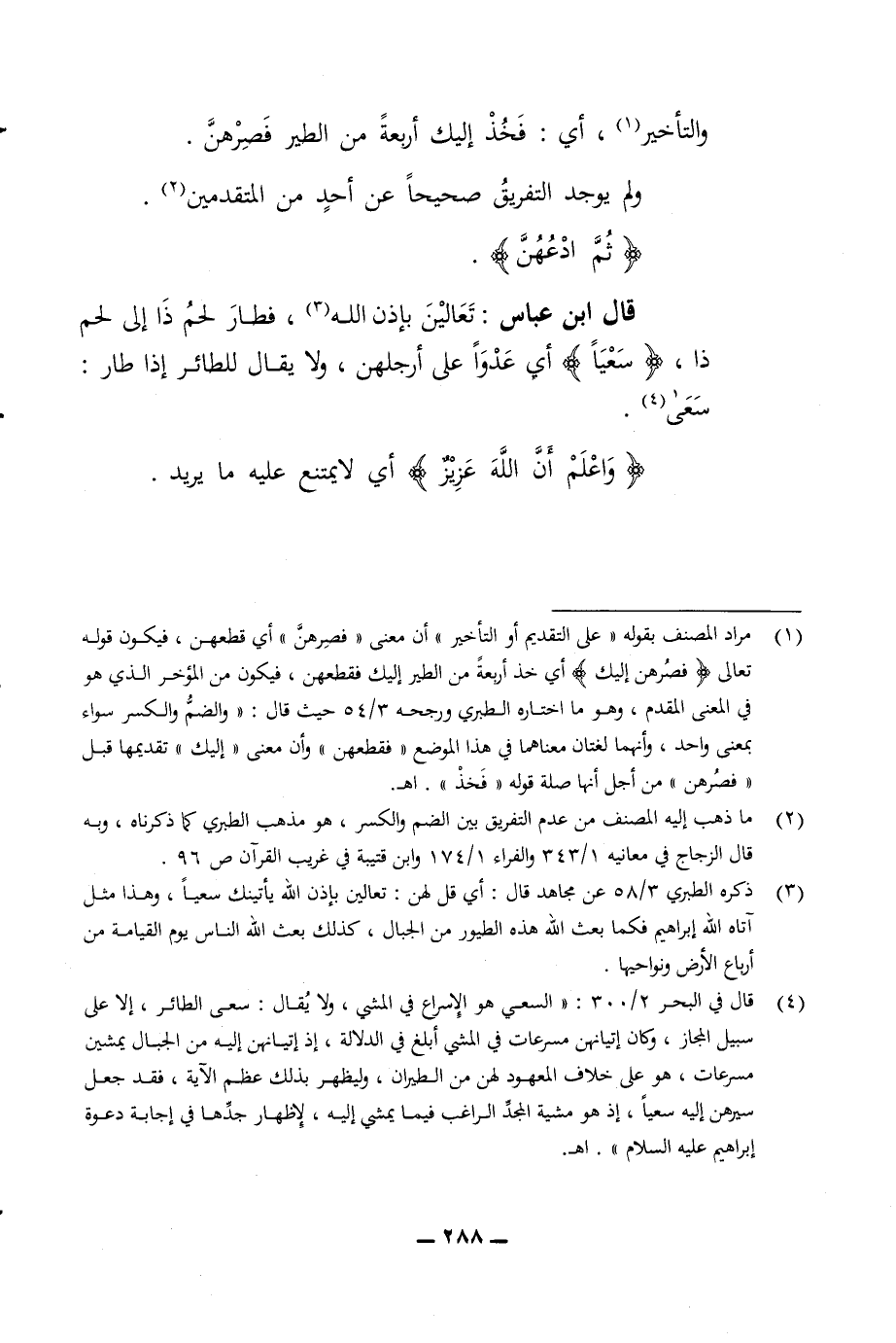 والتأخير أي فخذ اليك اربعة من الطير فصرهن ولم يوجد التفريق صحيحا عن احد من المتقدمين ادعهن قال ابن عباس تعالين باذن الله فطار لحم ذا الى لحم ذا سعيا أي عدوا على ارجاهن لو ولا يقال للطائر إذا طار سعى واعلم ان الله عزيز أي لا يمتنع عليه ما يريد