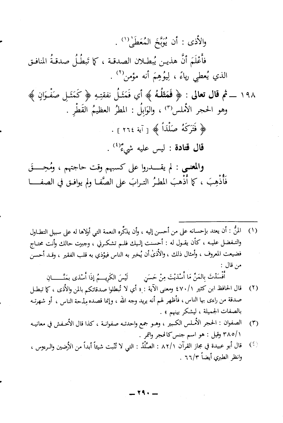والاذى أن يوبخ المعطى فاعلم أن هذين يبطلان الصدقة كما تبطل صدقة المنافق الذي يعطي رياء ليوهم انه مؤمن 198 - ثم قال تعالى فمثله أي فمثل نفقته كمثل صفوان وهو الحجر الاملس مع والوابل المطر العظيم القطر فتركه صلدا قال قتادة ليس عليه شئ والمعنى لم يقدروا على كسبهم وقت حاجتهم ومحق فأذهب كما أذهب المطر التراب على الصفا ولم يوافق في الصفا