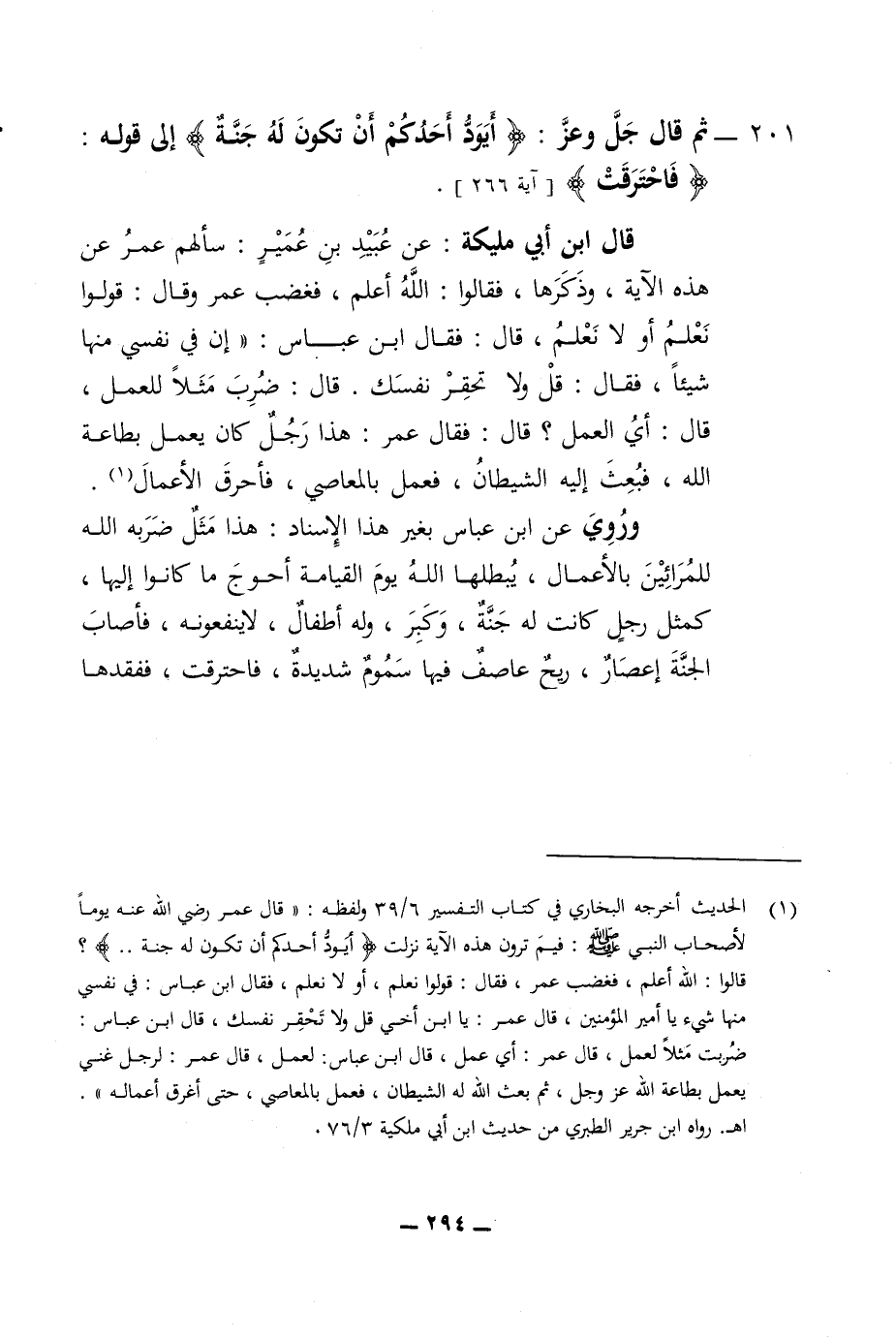 201 - ثم قال جل وعز أيود احدكم أن تكون له جنة الى قوله فاحترقت قال ابن ملكية عن عبيد بن عمير سألهم عمر عن هذه الآية وذكرها فقالوا الله أعلم فغضب عمر وقال قولوا نعلم أو لا نعلم قال فقال ابن عباس ان في نفسي منها شيئا فقال قل ولا تحقر نفسك قال ضرب مثلا للعمل قال أي العمل قال فقال عمر هذا رجل كان يعمل بطاعة الله فبعث إليه الشيطان فعمل بالمعاصي فأحرق الاعمال وروي عن ابن عباس بغير هذا الاسناد هذا مثل ضربه الله للمرائين بالاعمال يبطلها الله يوم القيامة أحوج ما كانوا إليها كمثل رجل كانت له جنة وكبر وله أطفال لا ينفعونه فأصاب الجنة اعصار ريح عاصف فيها سموم شديدة فاحترقت ففقدها