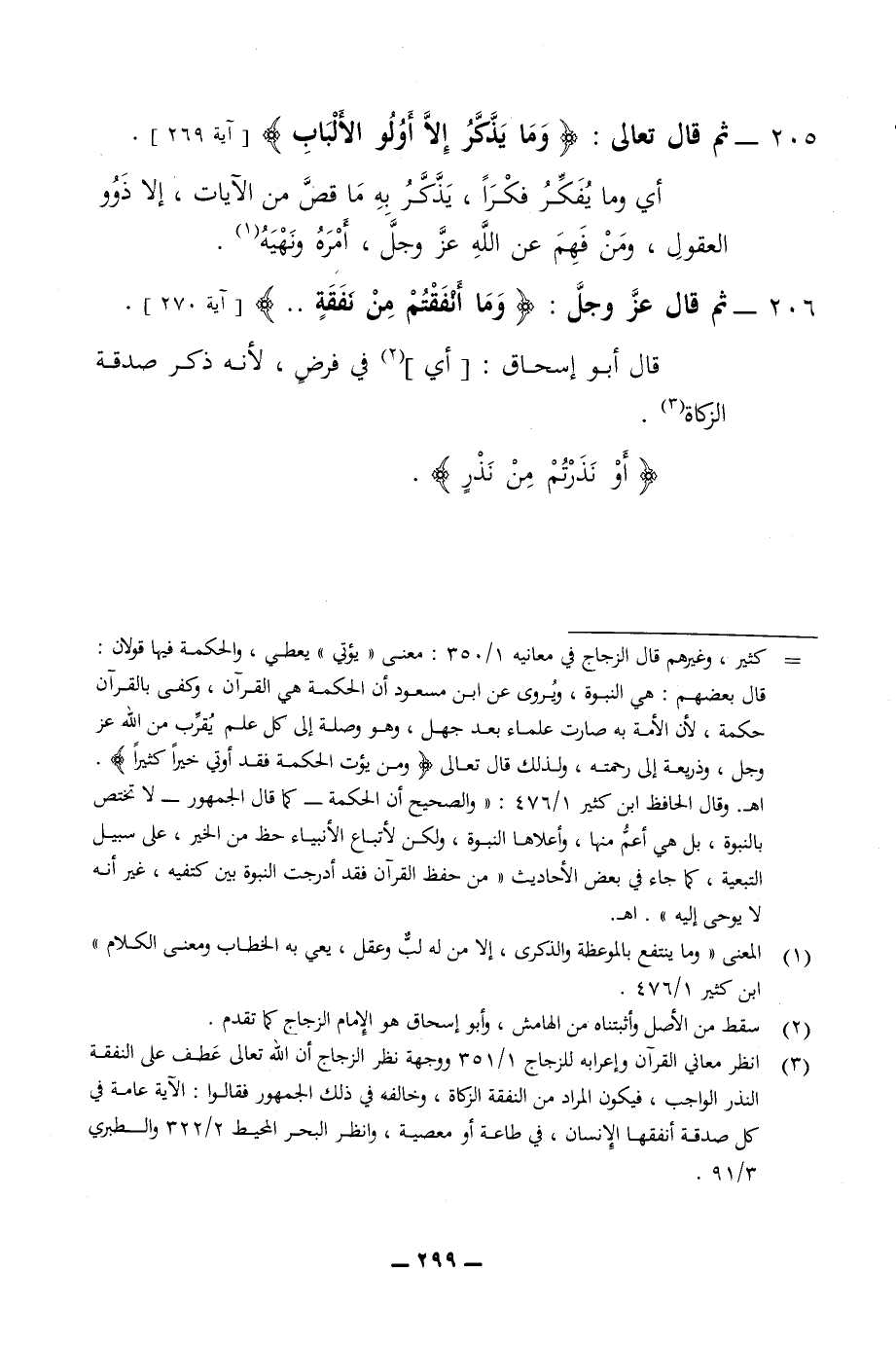 205 - ثم قال تعالى وما يذكر الا أولو الالباب أي ومل يفكر فكرا يذكر به ما قص من الآيات الا ذوو العقول ومن فهم الله عز وجل أمره ونهيه 206 - ثم قال عز وجل وما انفقتم من نفقة