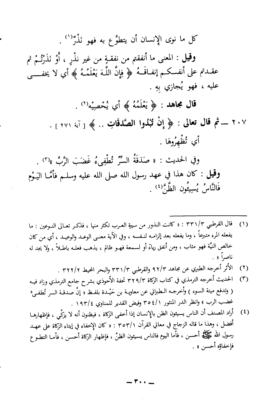 كل ما نوى الانسان أن يتطوع به فهو نذر وقيل المعنى ما انفقتم من نفقة من غير نذر أو انذرتم ثم عقدتم على أنفسكم أنفاقه فإن الله يعلمه أي لا يخفى عليه فهو يجازي به قال مجاهد يعلمه أي يحصيه 207 - ثم قال تعالى أن تبدوا الصدقات أي تظهروها وفي الحديث صدقة السر تطفئ غضب الرب وقيل كان في عهد رسول الله صلى الله عليه وسلم فاما اليوم فالناس يسيئون الظن