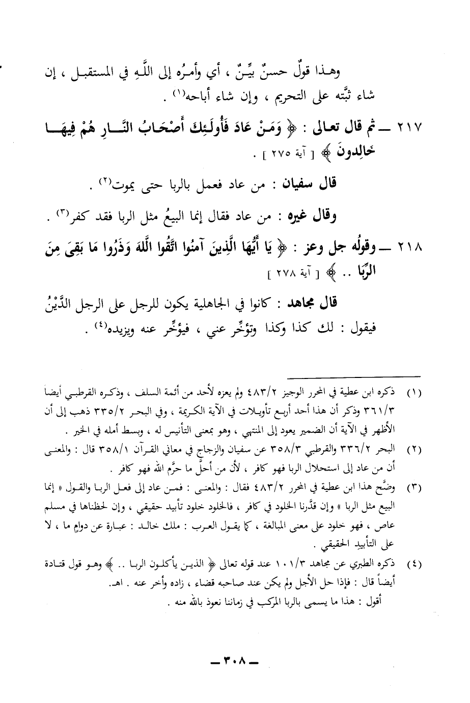 وهذا قول حسن بين أي وأمره الى الله في المستقبل ان شاء ثبته على التحريم وان شاء اباحه 217 - ثم قال تعالى ومن عاد فأولئك أصحاب النار هم فيها خالدون قال سفيان من عاد فعمل بالربا حتى يموت وقال غيره من عاد فقال انما البيع مثل الربا فقد كفر 218 - وقوله جل وعز يا ايها الذين امنوا اتقوا الله وذروا ما بقى من الربا قال مجاهد كانوا في الجاهلية يكون للرجل على الرجل الدين