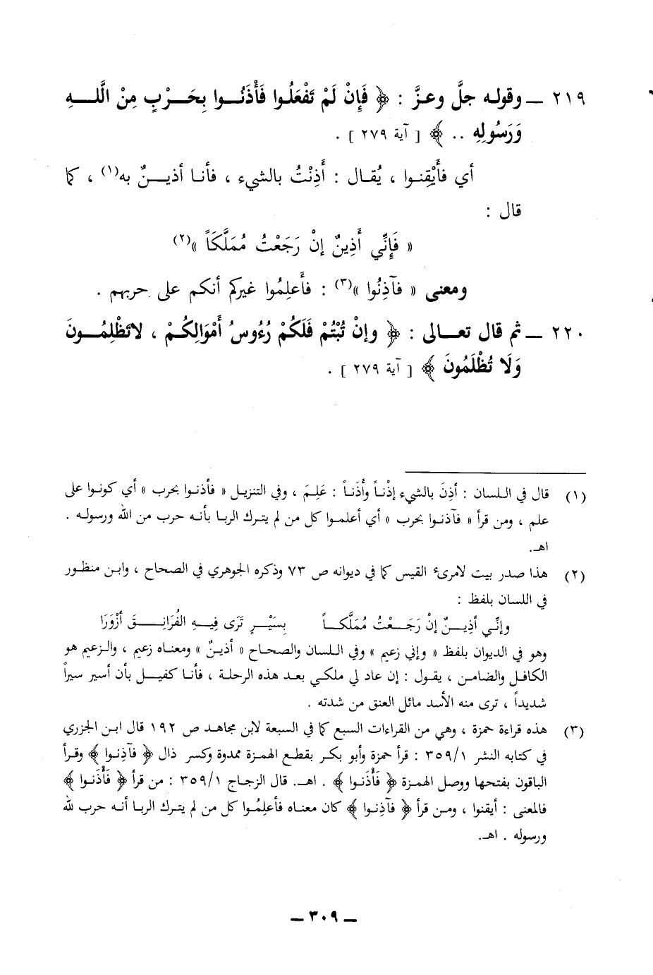 219 - وقوله جل وعز فان لم تفعلوا فادنوا بحرب من الله ورسوله أي فا يقنوا يقال أذنت بالشئ فانا اذين به كما قال فاني اذين ان رجعت مملكا ومعنى فآذنوا فأعملوا غيركم انكم على حربهم 220 - ثم قال تعالى وان تبتم فلكم رءوس أموالكم لا تظلمون ولا تظلمون