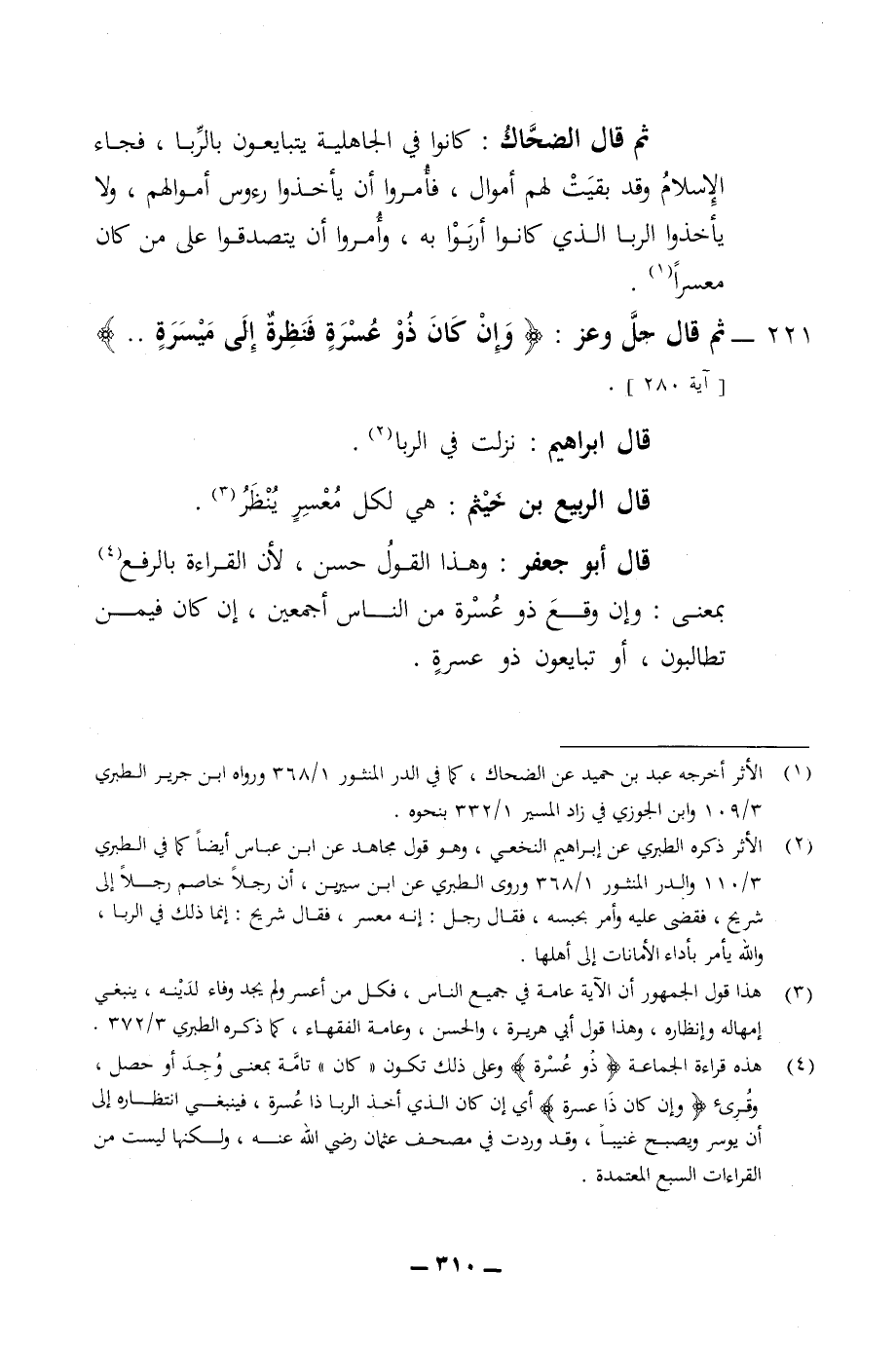 ثم قال الضحاك كانوا في الجاهلية يتبايعون بالربا فجاء الاسلام وقد بقيت لهم اموال فامروا ان يأخذوا رءوس أموالهم ولا يأخذوا الربا الذي كانوا أربوا به وأمروا أن يتصدقوا على من كان معسرا 221 - ثم قال جل وعز وان كان ذو عسرة فنظرة الى ميسرة قال ابراهيم نزلت في الربا قال الربيع بن خيثم هي لكل معسر ينظر قال أبو جعفر وهذا القول الحسن لان القراءة بالرفع بمعنى وان وقع ذو عسرة من الناس أجمعين أم كان فيمن تطالبون أو تبايعون ذو عسر ة