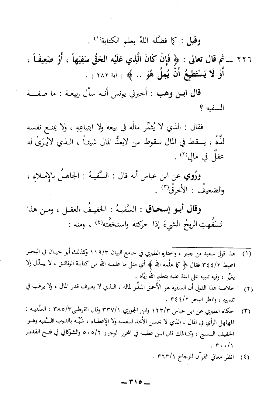 وقيل كما فضله الله بعلم الكتابة 226 - ثم قال تعالى فان كان الذي عليه الحق سفيها أو ضعيفا أو لا يستطيع ان يمل هو قال ابن وهب أخبرني يونس انه سال ربيعة ما صفة السفيه فقال الذي لا يثمر ماله في يدعه ولا أبتياعه ولا يمنع نفسه لذة يسقط في المال سقوط من لا يعد المال شيئا الذي لا يرى له عقل في مال وروي عن ابن عباس انه قال السفيه الجاهل با لاملاء والضعيف الاخرق وقال أبو اسحاق السفيه الخفيف العقل ومن هذا تسفهت الريح إذا حركته واستخفته: ومنه