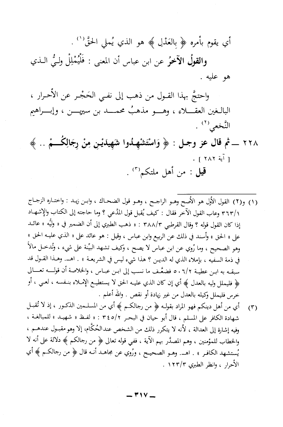 أي يقوم بأمره بالعدل هو الذي يملي الحق والقول الاخر عن ابن عباس ان المعنى فليملل ولي الذي هو عليه واحتج بهذا القول من ذهب الى نفي الحجر عن الاحرار البالغين العقلاء وهو مذهب محمد بن سيرين وابراهيم النخعي 228 - ثم قال عز وجل واستشهدوا شهيدين من رجالكم قيل من أهل ملتكم