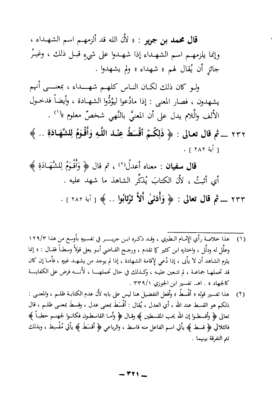 قال محمد ابن جرير لان الله قد الزمهم اسم الشهداء وانما يلزمهم اسم الشهداء إذا شهدوا على شئ قبل ذلك وغير جائز ان يقال لهم شهداء ولم يشهدوا ولو كان ذلك لكان الناس كلهم شهداء بمعنى انهم يشهدون فصار المعنى إذا ما دعوا ليؤدوا الشهادة وايضا فدخول الالف واللام يدل على ان المعني بالنهي شخص معلوم 232 ثم قال تعالى ذلكم اقسط عند الله وأقوم للشهادة قال سفيان معناه أعدل ثم قال وأقوم الشهادة أي أثبت لان الكتاب يذكر الشاهد ما شهد عليه 233 - ثم قال تعالى وأدنى الا ترتابوا