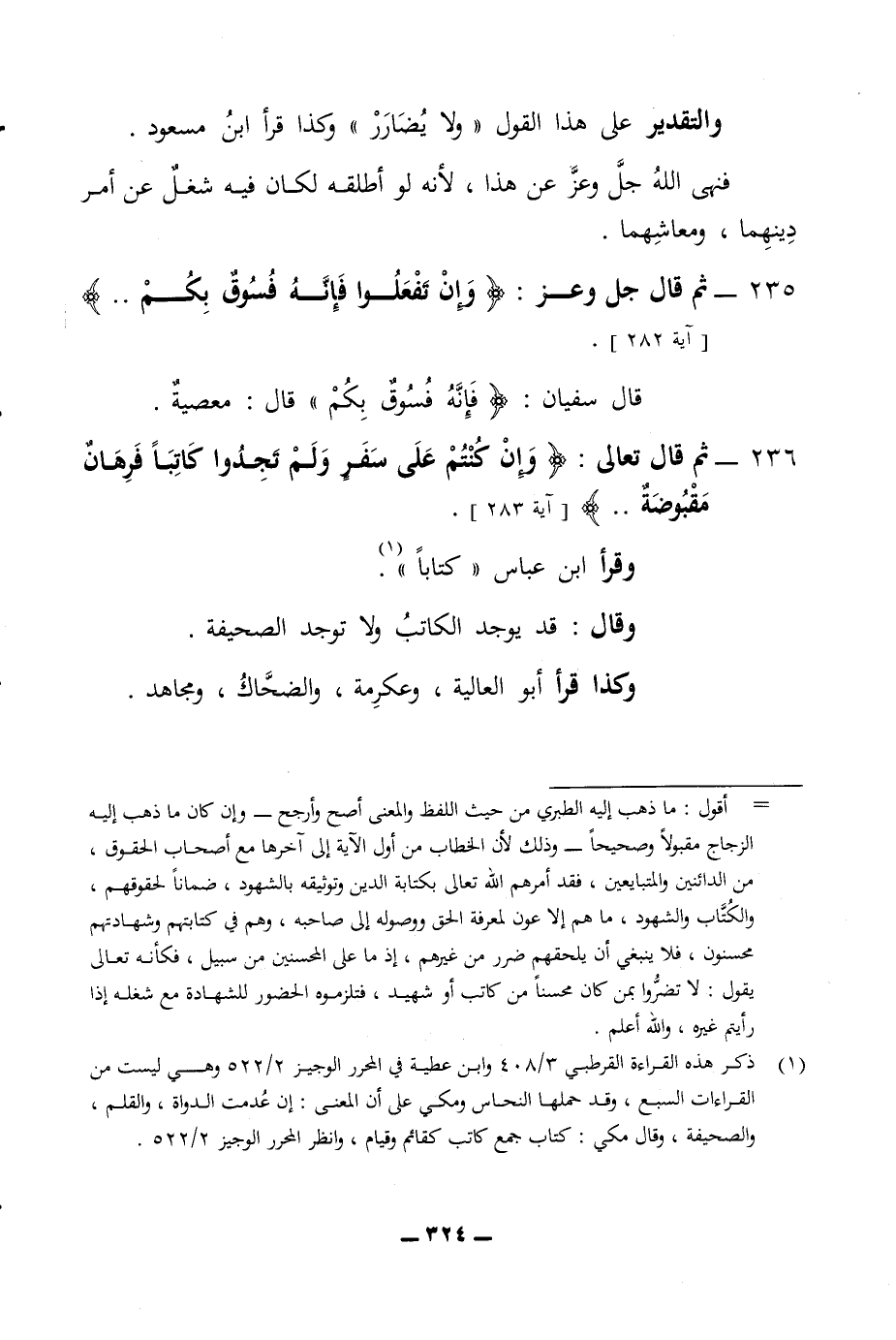 والتقدير على هذا القول ولا يضارر وكذا قرأ ابن مسعود فنهى الله جل وعز عن هذا لانه لو أطلقه لكان فيه شغل عن أمر دينهما ومعاشهما 235 - ثم قال جل وعز وان تفعلوا فانه فسوق بكم قال سفيان فانه فسوق بكم قال معصية 236 - ثم قال تعالى وان كنتم على سفر ولم تجدوا كاتبا فرهان مقبوضة وقرأ ابن عباس كتابا وقال قد يوجد الكاتب ولا توجد الصحيفة وكذا قرأ أبو العالية وعكرمة والضحاك ومجاهد