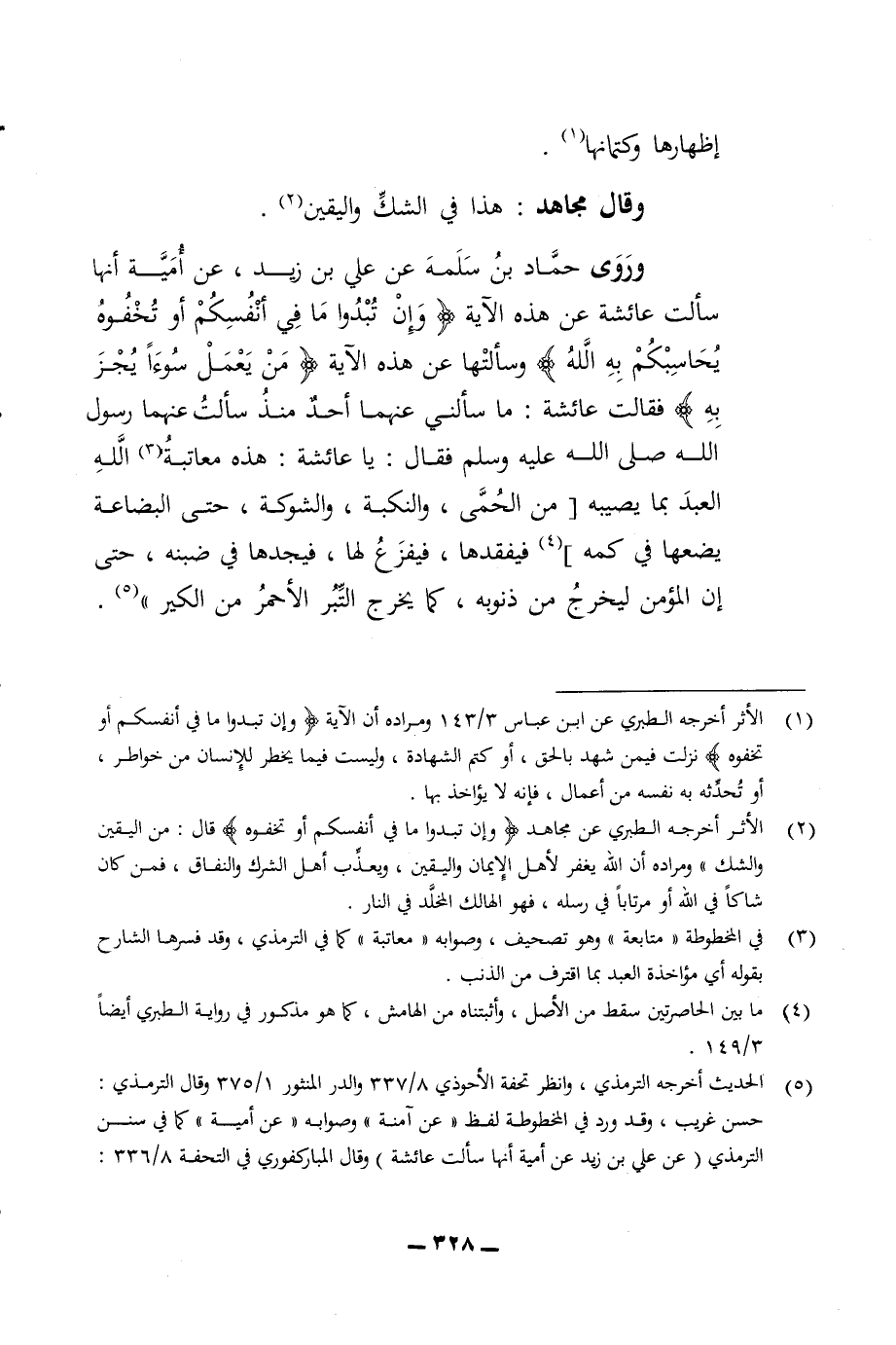اظهارها وكتمانها وقال مجاهد هذا في الشك واليقين وروى حماد بن سلمة عن علي بن زيد عن أمية انها سالت عائشة عن هذه الآية وان تبدوا ما في انفسكم أو تخفوه يحاسبكم به الله وسألتها عن هذه الآية من يعمل سوءا يجز به فقالت عائشة ما سألني عنهما أحد منذ سألت رسول الله صلى الله عليه وسلم فقال يا عائشة هذه معاتبة الله العبد بما يصيبه من الحمى والنكبة والشوكة حتى البضاعة يضعها في كمه فيفقدها فيفزع لها فيجدها في ضبنه حتى