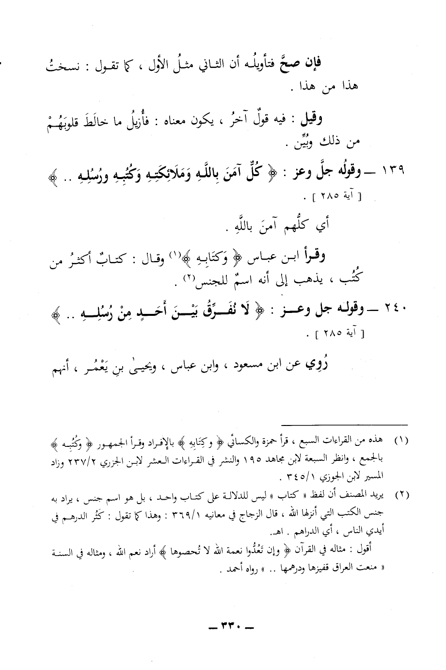 فان صح فتاويله ان الثاني مثل الاول كما تقول نسخت هذا من هذا وقيل فيه قول أخر يكون معناه فأزيل ما خالط قلوبهم من ذلك وبين 239 - وقوله جل وعز كل آمن بالله وملائكته وكتبه ورسله أي كلهم آمن بالله وقرأ ابن عباس وكتابه وقال كتاب أكثر من كتب يذهب الى انه اسم للجنس 240 - وقوله جل وعز لا نفرق بين احد من رسله