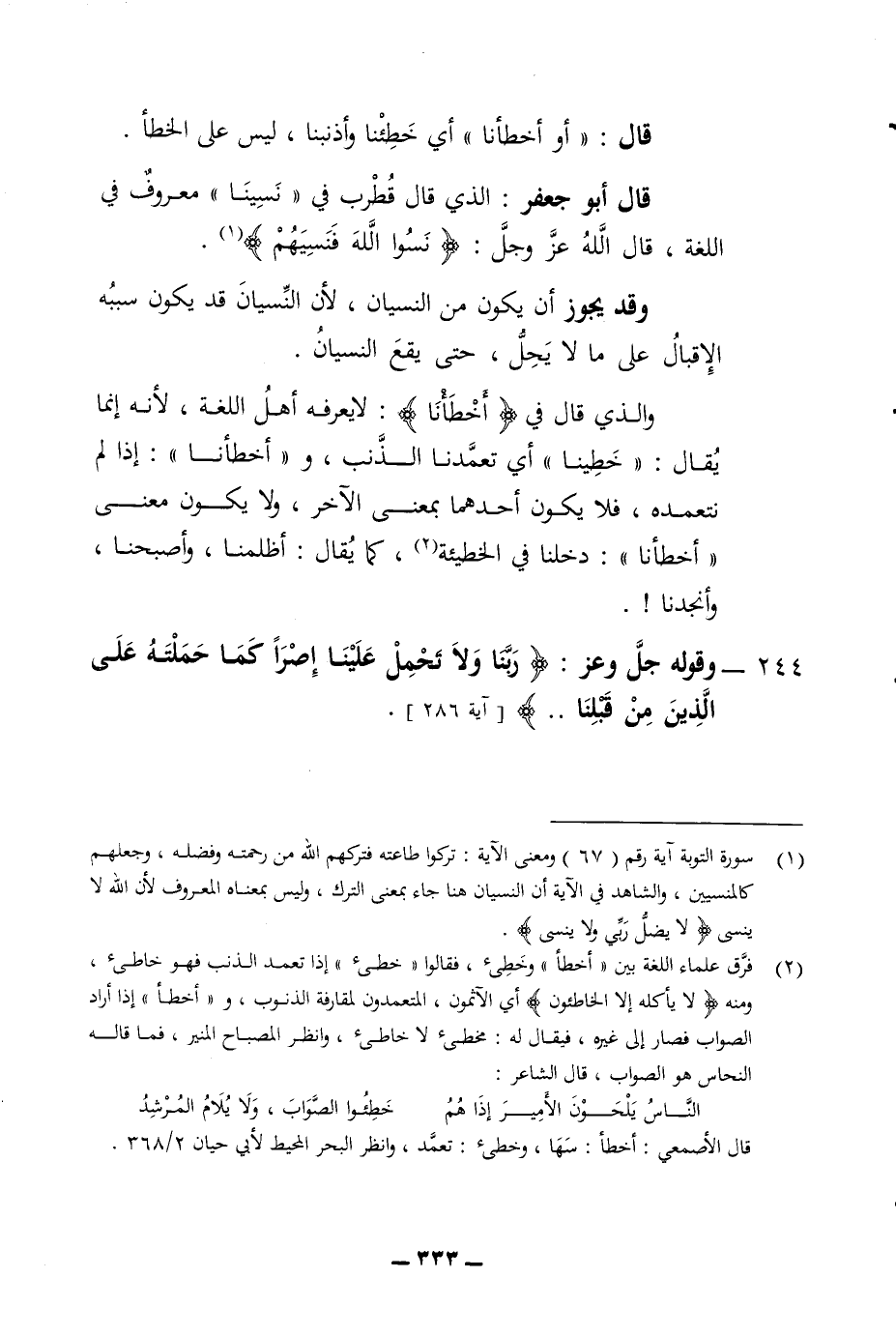 قال أو أخطانا أي خطئنا واذنبنا النبي ليس على الخطأ قال أبو جعفر الذي قال قطرب في نسينا معروف في اللغة قال عز وجل نسو الله فنسيهم وقد يجوز ان يكون من النسيان لان النسيان قد يكون سببه الاقبال على ما لا يحل حتى يقع النسيان والذي قال في أخطأنا لا يعرفه أهل اللغة لانه انما يقال خطينا أي تعمدنا الذنب وأخطأنا إذا لم نتعمده فلا يكون أحدهما بمعنى الآخر ولا يكون معنى أخطأنا دخلنا في الخطيئة كما يقال أظلمنا وأصبحنا وأنجدنا 244 - وقوله جل وعز ربنا ولا تحمل علينا اصرا كما حملته على الذين من قبلنا