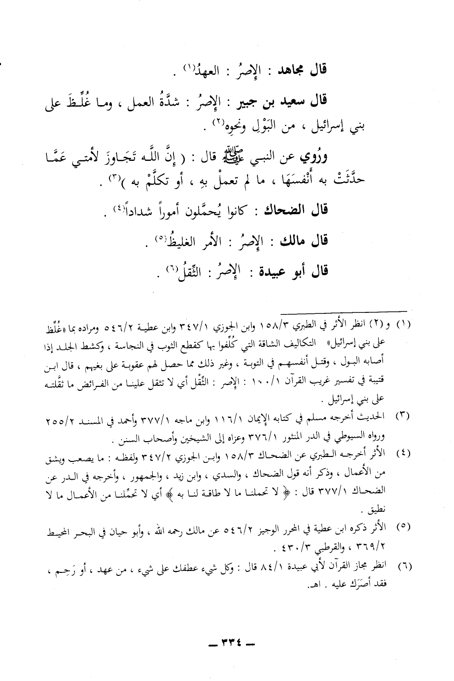 قال مجاهد الاصر العهد قال سعيد بن حبير الاصر شدة العمل وما غلظ على بني اسرائيل من البول ونحوه وروي عن النبي صلى الله عليه وسلم قال ان الله تجاوز لامتي عما حدثت به انفسها ما لم تعمل به أو تكلم به قال الضحاك كانوا يحملون أمور اشدادا قال مالك الاصر الامر الغليظ قال أبو عبيدة الاصر الثقل
