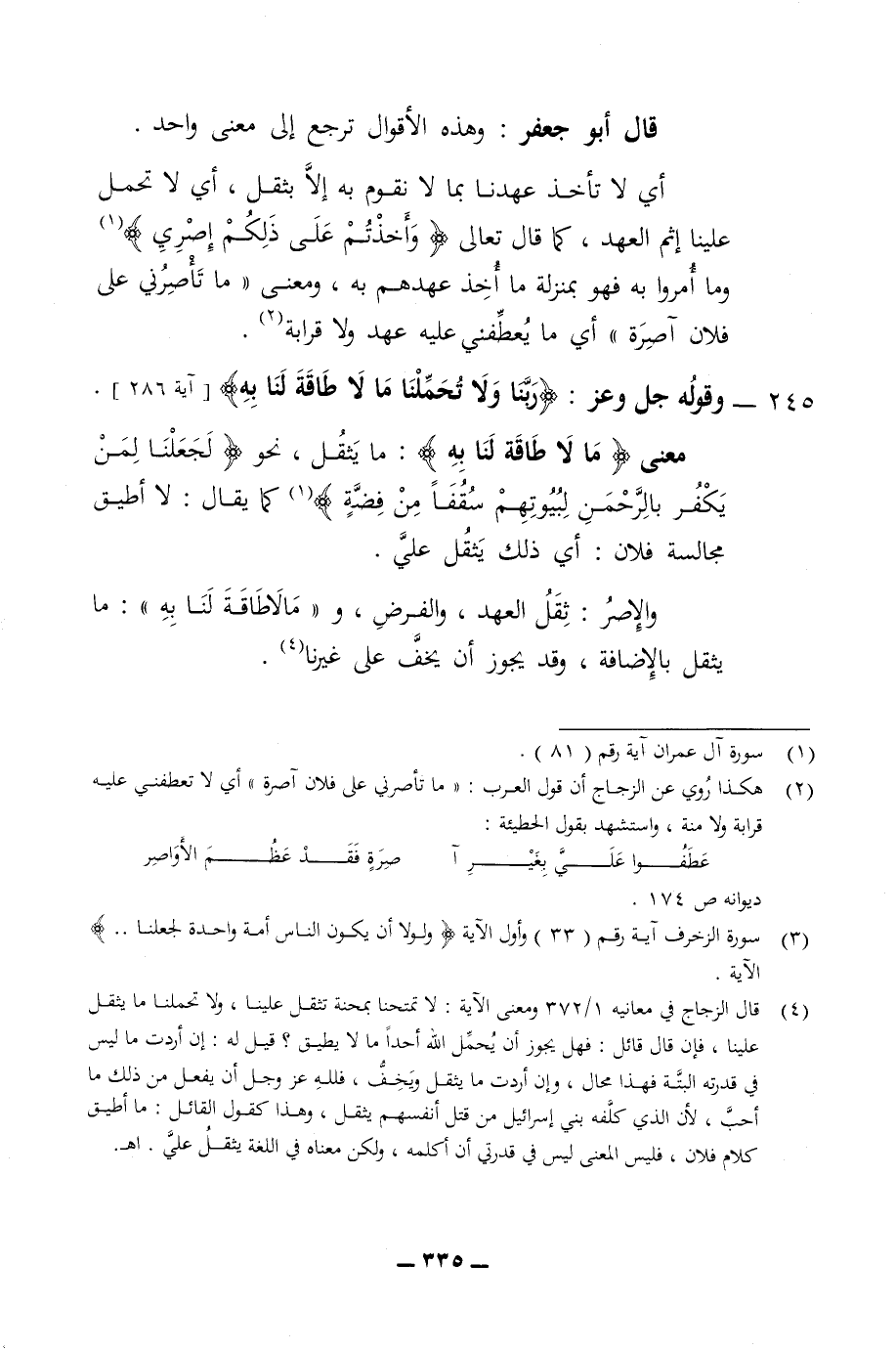 قال أبو جعفر وهذه الاقوال ترجع الى معنى واحد أي لا تأخذ عهدنا بما لا نقوم به الا بثقل أي لا تحمل علينا اثم العهد كما قال تعالى وأخذتم على ذلكم اصري وما امروا به فهو بمنزلة ما اخذ عهدهم به ومعنى ما تأصرني وإن على فلان آصرة أي ما يعطفني عليه عهد ولا قرابة 245 - وقوله جل وعز ربنا ولا تحملنا ما لا طاقة لنا به معنى ما لا طاقة لنا به ما يثقل نحو لجعلنا لمن يكفر بالرحمن لبيوتهم سقفا من فضة كما يقال لا اطيق مجالسة فلان أي ذلك يثقل علي والاصر ثقل العهد والفرض وما لا طاقة لنا به ما يقل بالاضافة وقد يجوز ان يخف على غيرنا