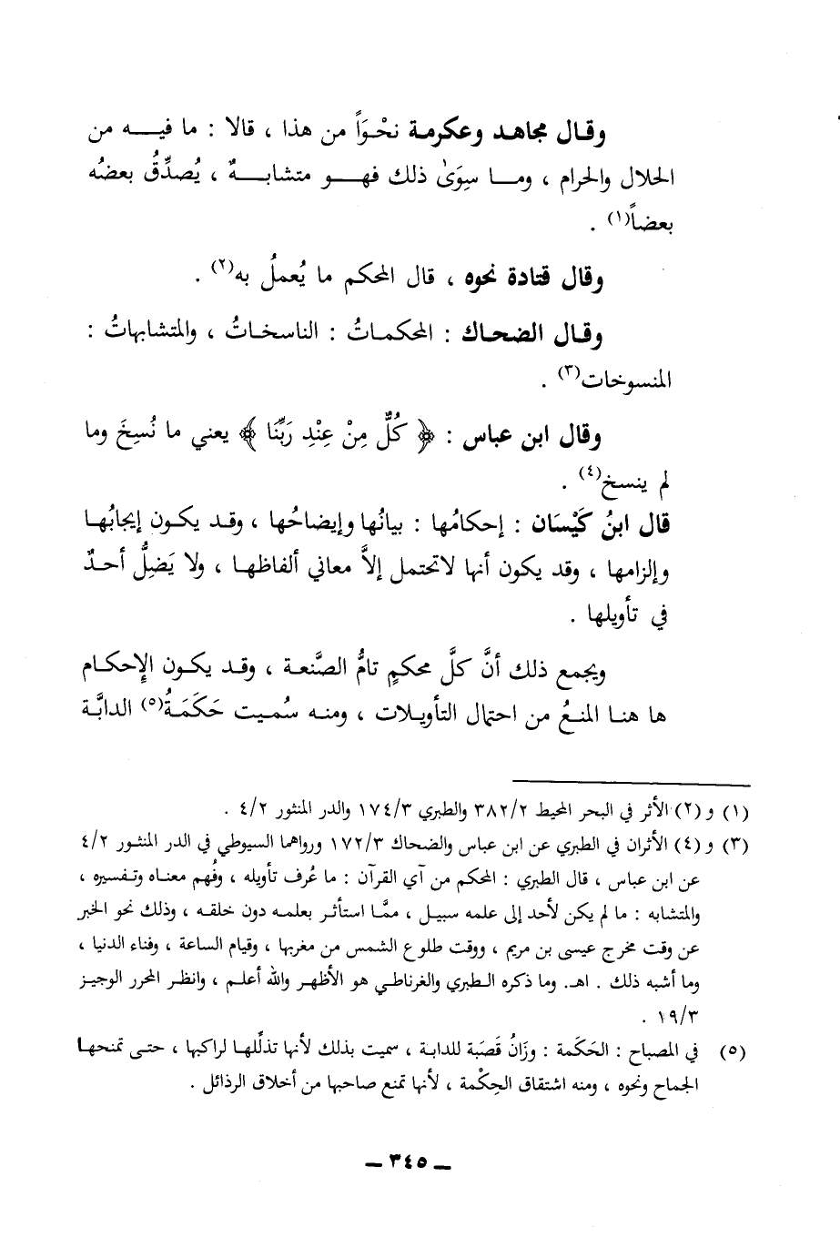 وقال مجاهد وعكرمة نحوا من هذا قالا ما فيه من الحلال والحرام وما سوى ذلك فهو متشابه يصدق بعضه بعضا وقال قتادة نحوه قال المحكم ما يعمل به وقال الضحاك المحكمات الناسخات والمتشابهات المنسوخات وقال ابن عباس كل من عند ربنا يعني ما نسخ وما لم ينسخ قال ابن كيسان احكامها بيانها وايضاحها وقد يكون ايجابها والزامها وقد يكون انها لا تحتمل الا معاني الفاظها ولا يضل أحد في تأويلها ويجمع ذلك ان كل محكم تام الصنعة وقد يكون الاحكام ها هنا المنع من احتمال التأويلات ومنه سميت حكمة الدابة