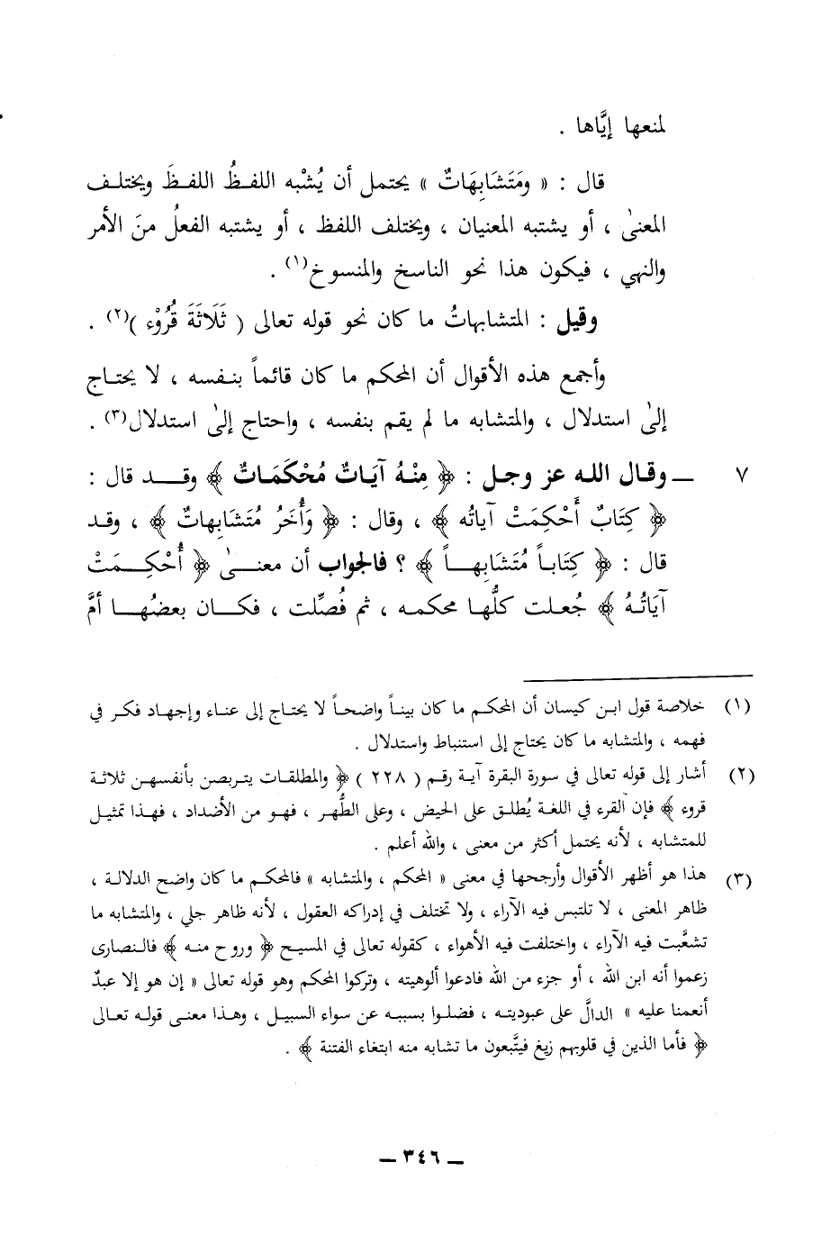 لمنعها اياها قال متشابهات يحتمل ان يشبه اللفظ اللفظ ويختلف المعنى أو يشتبه المعنيان ويختلف اللفظ أو يشتيه الفعل من الامر والنهي فيكون هذا نحو الناسخ والمنسوخ وقيل المتشابهات ما كان نحو قوله تعالى ثلاثة قروء وأجمع هذه الاقوال ان المحكم ما كان قائما بنفسه لا يحتاج الى استدلال والمتشابه ما لم يقم بنفسه واحتاج الى استدلال 7 - وقال الله عز وجل منه ايات محكمات وقد قال كتاب أحكمت آياته وقال واخر متشابهات وقد قال كتابا متشابها فالجواب ان معنى احكمت آياته جعلت كاها إلا محكمة ثم فصلت فكان بعضها أم