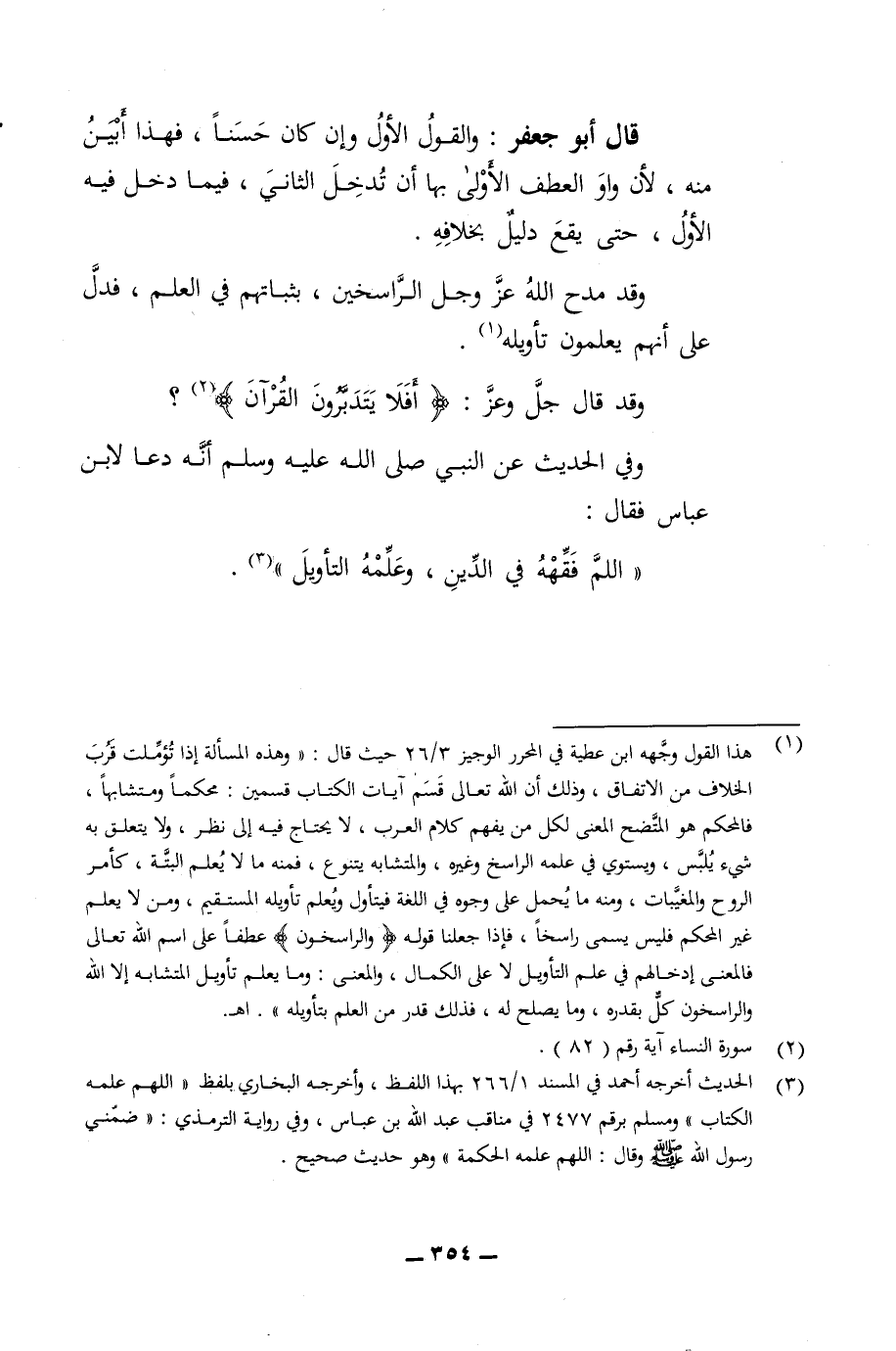 قال أبو جعفر والقول الاول وان كان حسنا فهذا أبين منه لان واو العطف الاولى بها ان تدخل الثاني فيما دخل فيه الاول حتى يقع دليل بخلافة وقد مدح الله عز وجل الراسخين بثباتهم في العلم فدل على انهم يعلمون تأويله وقد قال جل وعز أفلا يتدبرون القرآن وفي الحديث عن النبي صلى الله عليه وسلم انه دعا لابن عباس فقال اللهم فقهه في الدين وعلمه التأويل