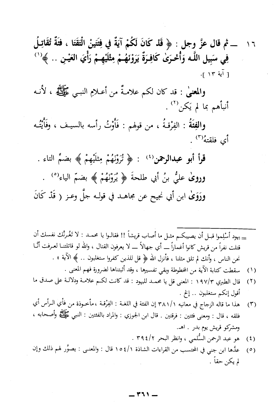 16 - ثم قال عز وجل قد كان لكم آية في فئتين التقتا فئة تقاتل في سبيل الله واخرى كافرة يرونهم مثليهم راي العين والمعنى قد كان لكم علامة من اعلام النبي صلى الله عليه وسلم لانه أنباهم بما لم يكن والفئة الفرقة من قولهم فأوت رأسه بالسيف وفأيته