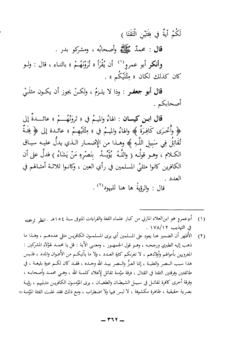 لكم أية في فئتين التقتا قال محمد صلى الله عليه وسلم واصحابه ومشركوا بدر وأنكر أبو عمرو ان يقرأ ترونهم بالتاء قال ولو كان كذلك لكان مثليكم قال أبو جعفر وذا لا يلزم ولكن يجوز ان يكون مثلي أصحابكم قال ابن كيسان الهاء والميم في ترونهم عائدة الى وأخرى كافرة والهاء والميم في مثليهم عائدة الى فئة تقاتل في سبيل الله وهذا من الاضمار الذي يدل عليه سياق الكلام وهو قوله والله يؤيد بنصره من يشاء فدل عل ان الكافرين كانوا مثلي المسلمين في رأي العين وكانوا ثلاثة أمثالهم في العدد قال والرؤية ها هنا لليهود