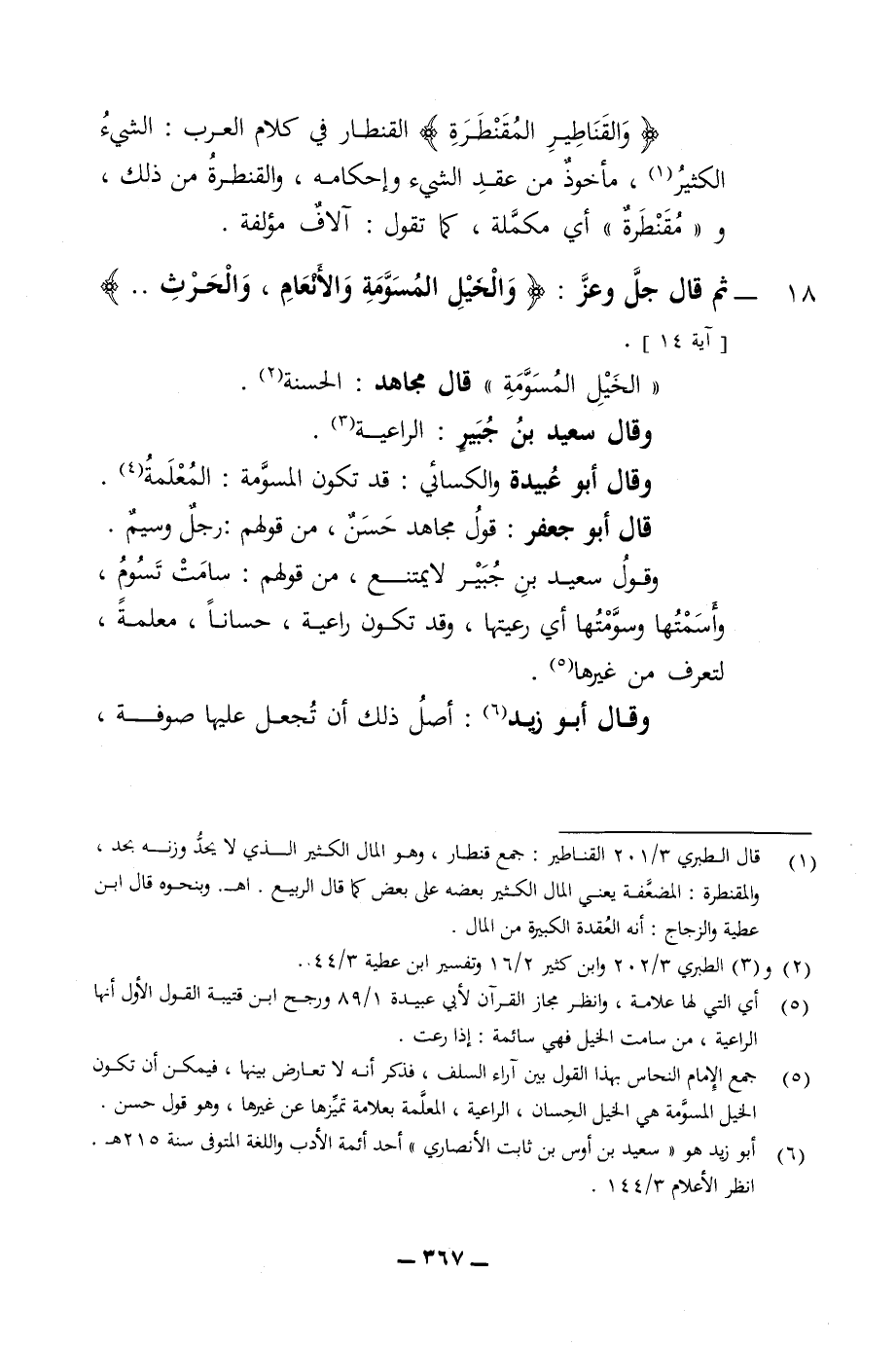 والقناطير المقنطرة القنطار في كلام العرب الشئ الكثير مأخوذ من عقد الشئ واحكامه والقنطرة من ذلك ومقنطرة به أي مكملة كما تقول الاف مؤلفة 18 - ثم قال جل وعز والخيل المسمومة والانعام والحرث الخيل المسمومة قال مجاهد الحسنة