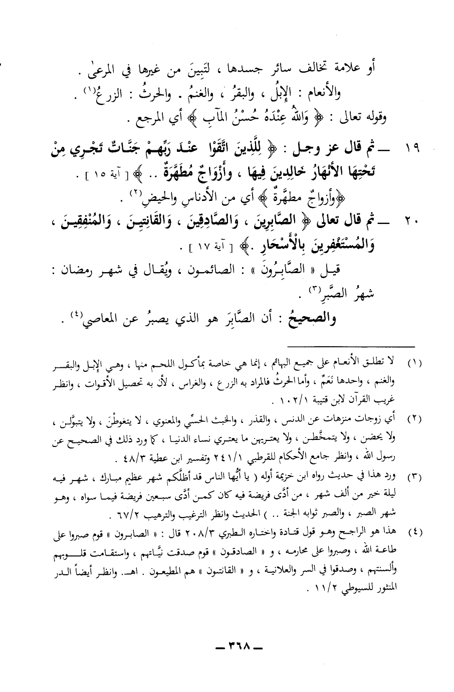 أو علامة تخالف سائر جسدها لتبين من غيرها في المرعى والانعام الابل والبقر والغنم والحرث الزرع وقوله تعالى والله عنده حسن المآب أي المرجع 19 - ثم قال عز وجل للذين اتقوا عند ربهم جنات تجري من تحتها الانهار خالدين فيها وازواج مطهرة وازواج مطهرة أي من الادناس والحيض 20 - ثم قال تعالى الصابرين والصادقين والقانتين والمنفقين والمستغفرين بالاسحار قيل الصابرون الصائمون ويقال في شهر رمضان شهر الصبر والصحيح ان الصابر هو الذي يصبر عن المعاصي