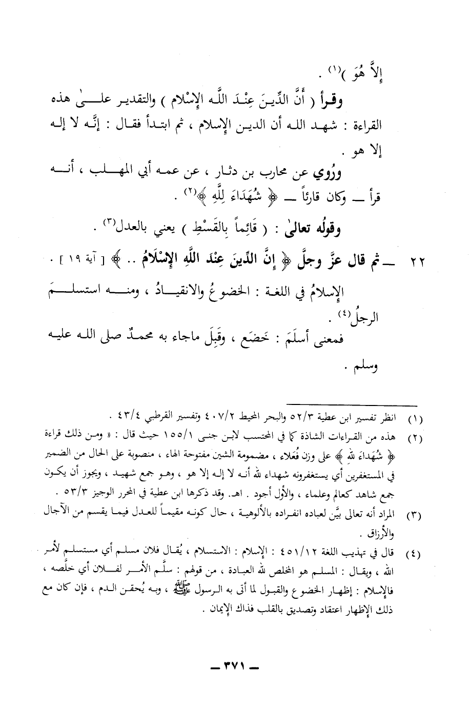 وقرأ ان الدين عند الله الاسلام والتقدير على هذه القرأة شهد الله ان الدين الاسلام ثم ابتدأ فقال انه لا اله الا هو وروي عن محارب ابن دثار عن عمه ابي المهلب انه قرأ وكان قارئا شهداء لله وقوله تعالى قائما بالقسط يعني بالعدل 22 - ثم قال جل وعز ان الدين عند الله الاسلام الاسلام في اللغة الخضوع والانقياد ومنه استسلم الرجل فمعنى اسلم خضع وقبل ما جاء به محمد صلى الله عليه وسلم