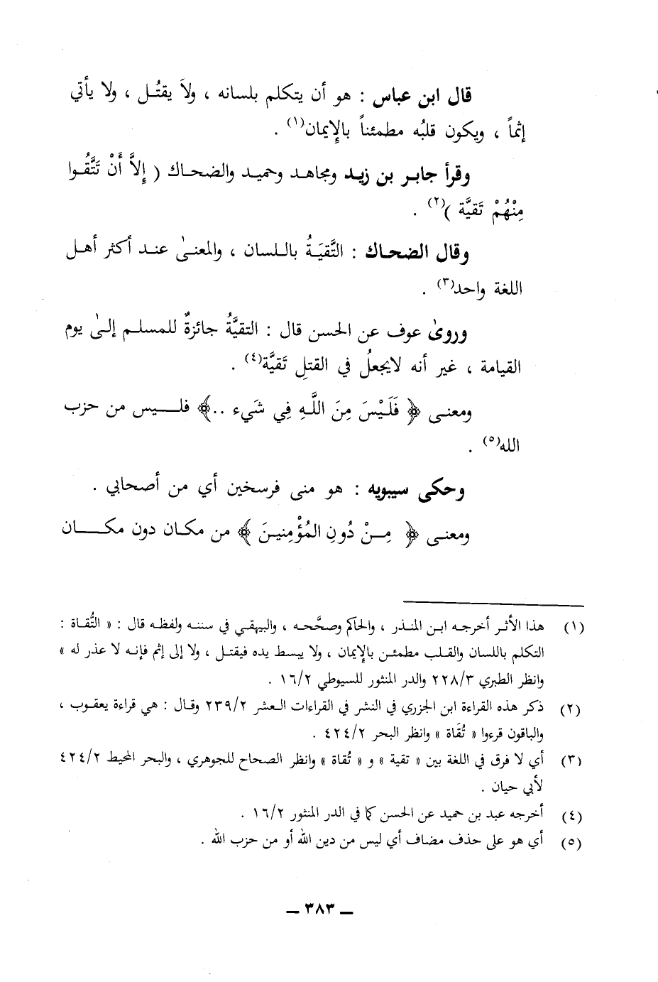 قال ابن عباس هو ان يتكلم بلسانه ولا يقتل ولا ياتي إنما ويكون قلبه مطمئنا بالايمان وقرأ جابر بن زيد ومجاهد وحميد والضحاك الا ان تتقوا منهم تقية وقال الضحاك التقية باللسان والمعنى عند اكثر أهل اللغة واحد