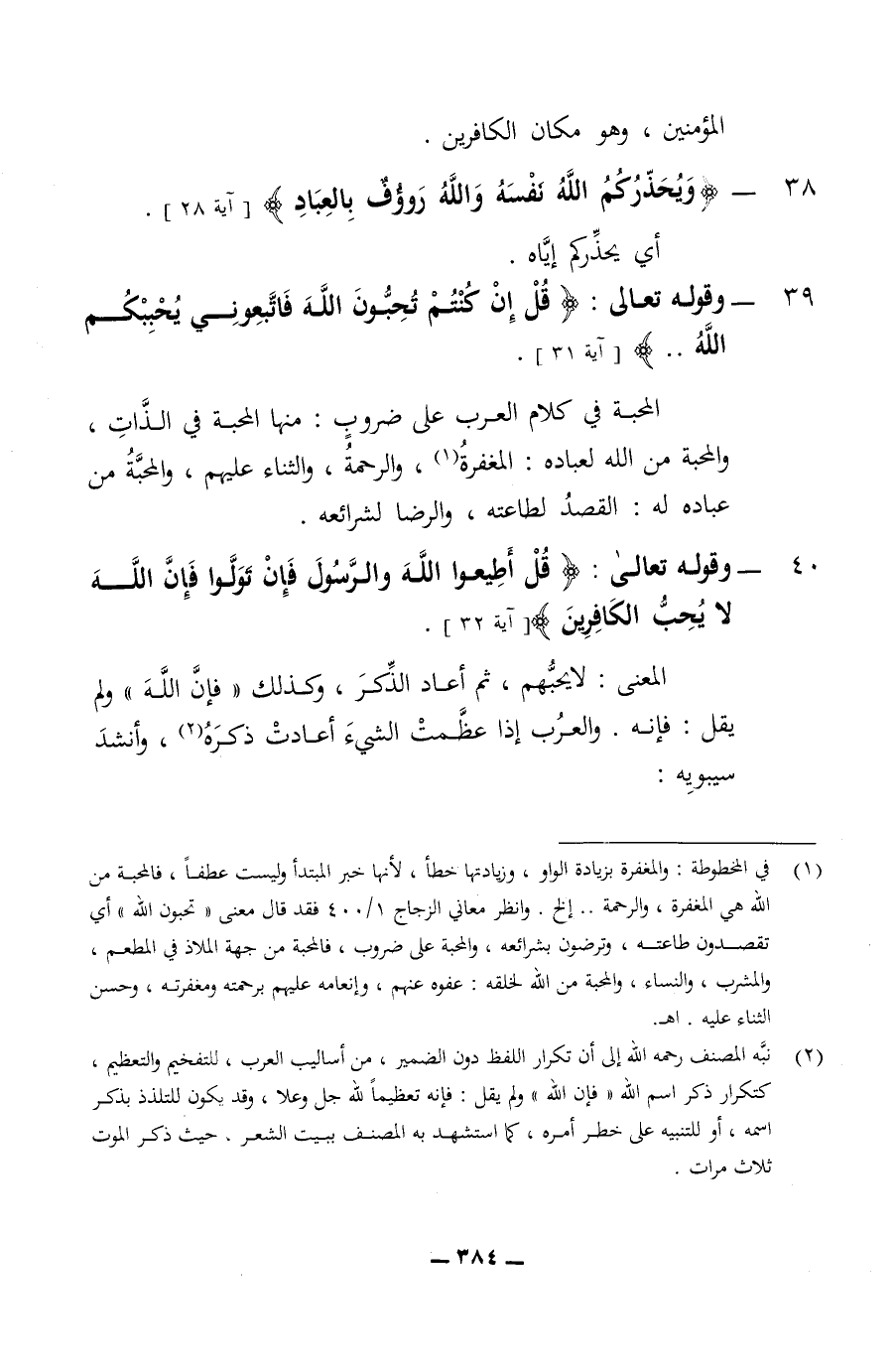 المؤمنين وهو مكان الكافرين 38 - ويحذركم الله نفسه والله رؤوف له بالعباد أي يحذركم أياه 39 - وقوله تعالى قل ان كنتم تحبون الله فاتبعوني يحببكم الله والمحبة في كلام العرب على ضروب منها الحبة في الذات والمحبة من الله لعباده المغفرة والرحمة والثناء عليها والمحبة من عباده له القصد لطاعته والرضا لشرائعه 40 - وقوله تعالى قل أطيعوا الله والرسول فإن تولوا فان الله لا يحب الكافرين المعنى لا يحبهم ثم أعاد الذكر وكذلك فان الله ولم يقل فانه والعرب إذا عظمت الشئ أعادت ذكره وانشد سيبويه