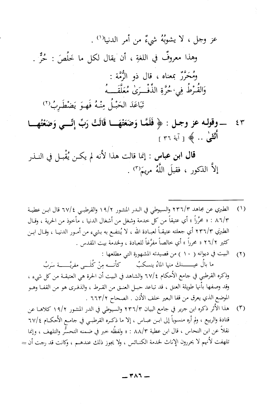 عز وجل لا يشوبه شئ من امر الدنيا وهذا معروف في اللغة ان يقال لكل ما خلص حر ومحرر بمعناه قال ذو الرمة * والقرط في حرة الذفرى معلقة * تباعد الحبل منه فهو يضطرب * 43 - وقوله عز وجل فلما وضعتها قالت رب اني وضعتها انثى قال ابن عباس انما قالت هذا لانه لم يكن يقبل في النذر الا الذكور فقبل الله مريم