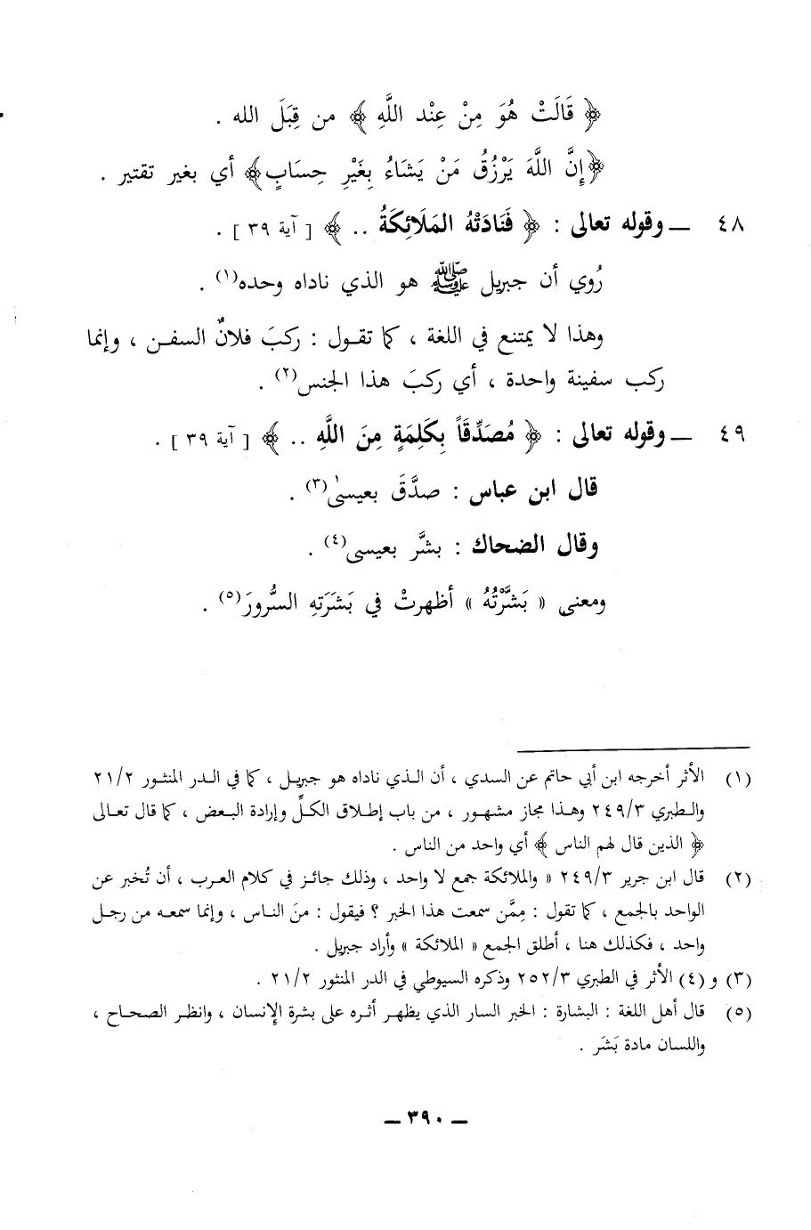 قالت هو من عند الله من قبل الله ان الله يرزق من يشاء بغير حساب أي بغير تقتير 48 - وقوله تعالى فنادته الملائكة روي أن جبريل صلى الله عليه وسلم هو الذي ناده وحده وهذا لا يمتنع في اللغة كما تقول ركب فلان السفن وانما ركب سفينة واحدة أي ركب هذا الجنس 49 - وقوله تعالى مصدقا بكلمة من الله قال ابن عباس صدق بعيسى وقال الضحاك بشر بعيسى ومعنى بشرته أظهرت في بشرته السرور