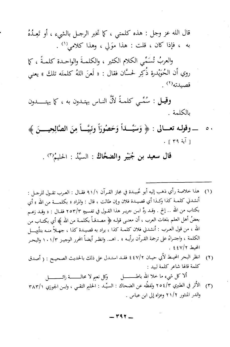 قال الله عز وجل هذه كلمتي كما تخبر الرجل بالشئ أو تعده به فإذا كان قلت هذا مولي وهذا كلامي والعرب تسمي الكلام الكثير والكلمة الواحدة كلمة كما روي ان الحويدرة ذكر لحسان فقال لعن الله كلمته تلك يعني قصيدته وقيل سمي كلمة لان الناس يهتدون به كما يهتدون بالكلمة 50 - وقوله تعالى وسيدا وحصورا ونبيا من الصالحين قال سعيد بن جبير والضحاك السيد الحليم