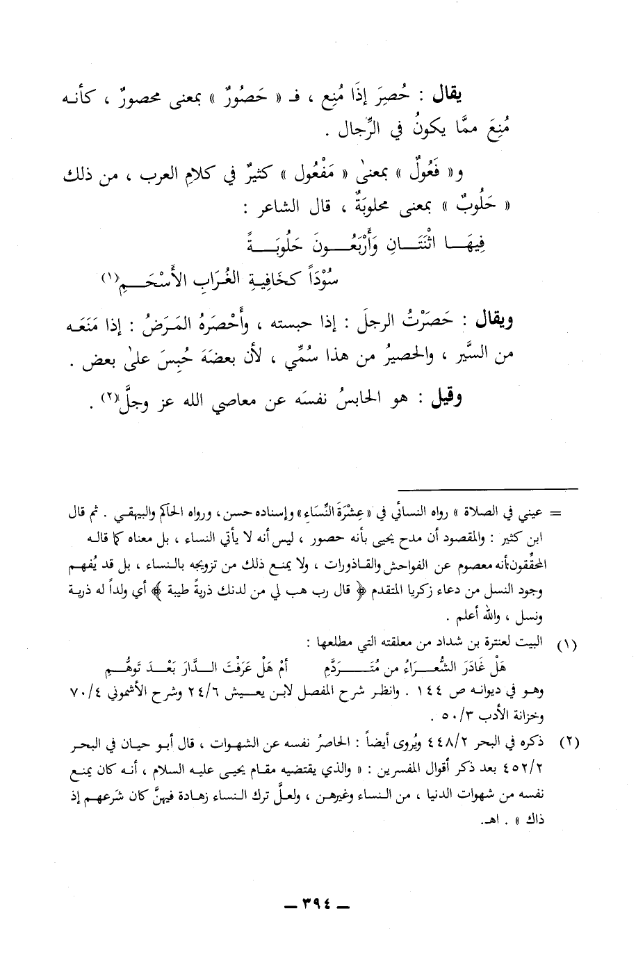 يقال حصر إذا منع ف حصور بمعنى محصور وكانه منع مما يكون في الرجال وفعول بمعنى مفعول كثير في كلام العرب من ذلك حلوب بمعنى محلوبة قال الشاعر * فيها اثنثان محمد واربعون حلوبة * سواد كخافيه إلى الغراب الاسحم * ويقال حصرت الرجل إذا حسبته واحصر كان المرض إذا منعه من السير والحصير من هذا سمي لان بعضة حبس على بعض وقيل هو الحابس نفسه عن معاصي الله عز وجل