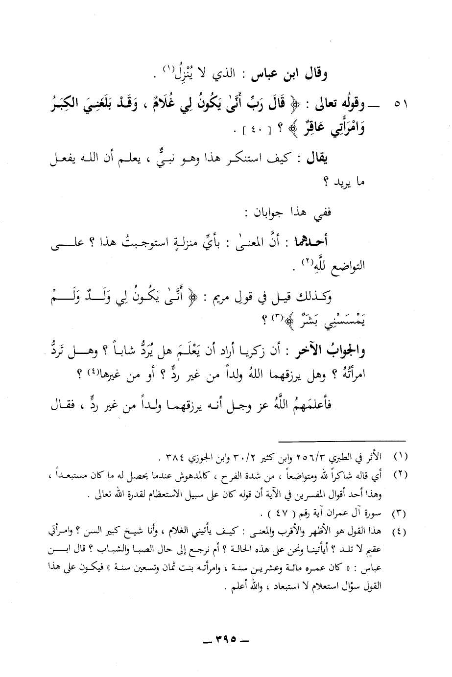 وقال ابن عباس الذي لا ينزل 51 - وقوله تعالى قال رب انى يكون لي غلام وقد بلغني الكبر وامراتي عاقرا يقال كيف استنكر هذا وهو نبي يعلم ان الله يفعل ما يريد ففي هذا جوابان احدهما ان المعنى بأي منزلة استوجبت هذا على التواضع لله وكذلك قيل في قول مريم أنى يكون لي ولد ولم