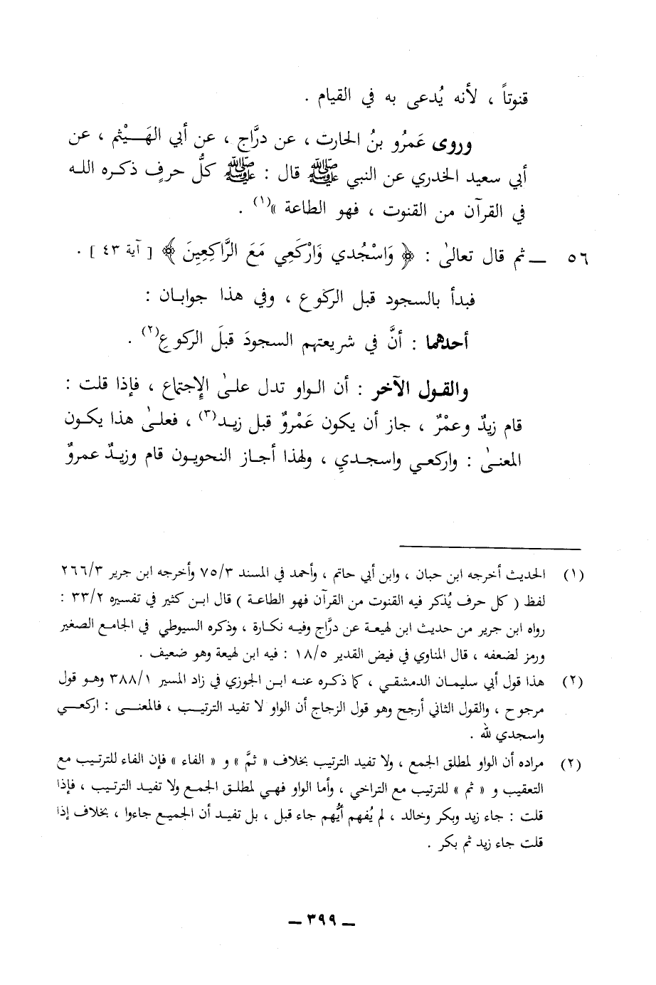 وفي هذا جوابان فبداء عبد بالسجود قبل الركوع أحدهما أن في شريعتهم السجود قبل الركوع والقول الاخر ان الواو تدل على الاجتماع فإذا قلت قام زيد وعمر جاز ان يكون عمر قبل زيد فعلى هذا يكون المعنى واركعي واسجدي ولهذا أجاز النحويون قام وزيد عمرو