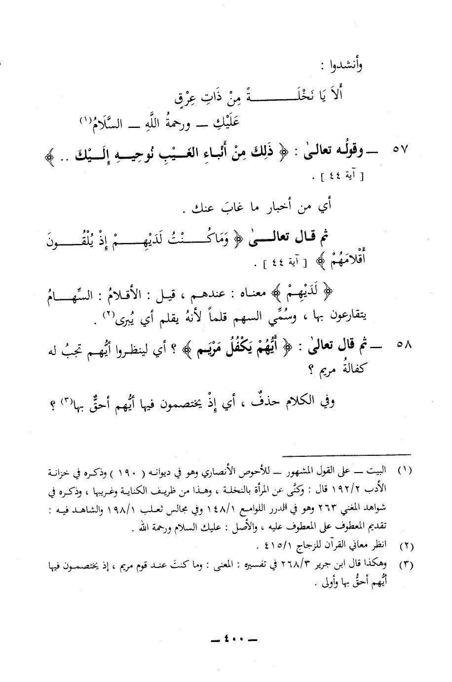 وأنشدوا * الا يا نخلة من ذات عرق * عليك ورحمة الله السلام * 57 - وقوله تعالى ذلك من انباء الغيب نوحيه اليك أي من اخبار ما غاب عنك ثم قال تعالى وما كنت لديهم إذ يلقون أقلامهم لديهم معناه عندهم قيل الاقلام السهام يتقارعون بها وسمي السهم قلما لانه يقلم أي يبرى 58 - ثم قال تعالى ايهم يكفل مريم أي لينظرو اأيهم تجب له كفالة مريم وفي الكلام حذف أي إذ يختصمون فيها أيهم أحق بها