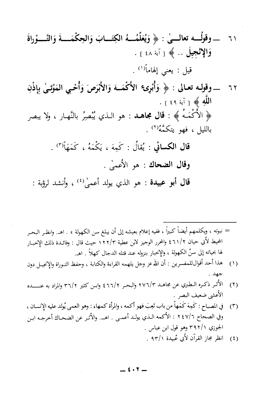 61 - وقوله تعالى ويعلمه الكتاب والحكمة والتوراة والانجيل قيل يعني الهاما 62 - وقوله تعالى وأبرئ الاكمة والابرص واحي الموتى باذن الله الاكمة قال مجاهد هو الذي يبصر في النهار ولا يبصر في الليل فهو يتكمه قال الكسائي يقال كمه يكمه كمها وقال الضحاك هو الاعمى قال أبو عبيدة هو الذي يولد اعمى وأنشد لرؤبة