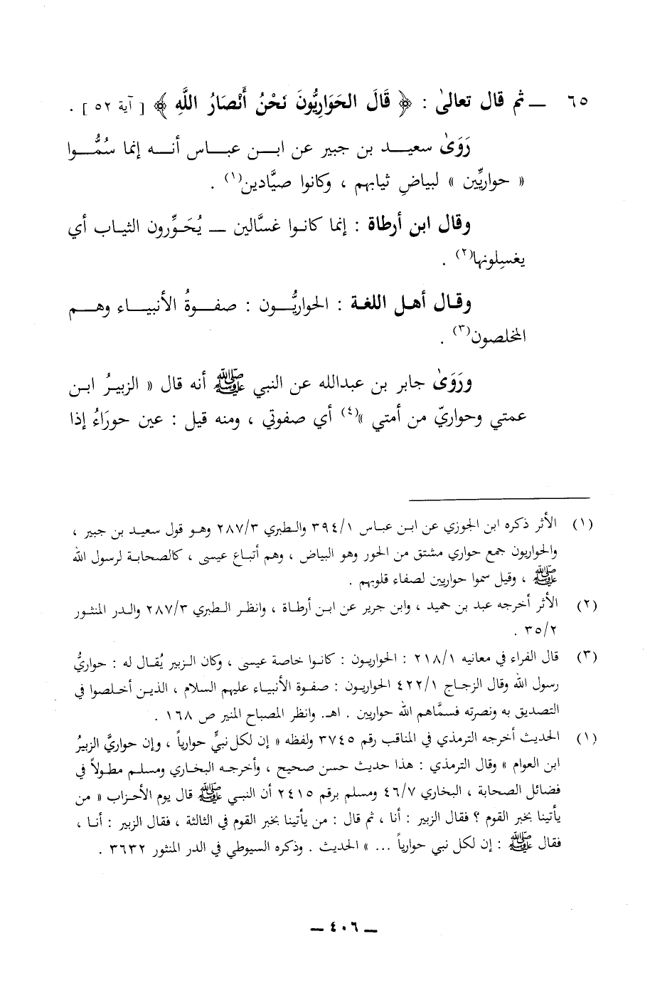 65 - ثم قال تعالى قال الحواريون نحن أنصار الله روى سعيد بن جبير عن ابن عباس انه انما سموا حواريين لبياض ثيابهم وكانوا صيادين وقال ابن أرطاة انما كانوا غسالين يحورون الثياب أي يغسلونها وقال أهل اللغة الحواريون صفوة الانبياء وهم المخلصون وروى جابر بن عبد الله عن النبي صلى الله عليه وسلم انه قال الزبير ابن عمتي وحواري من أمتي أي صفوتي ومنه قيل عن حوراء إذا