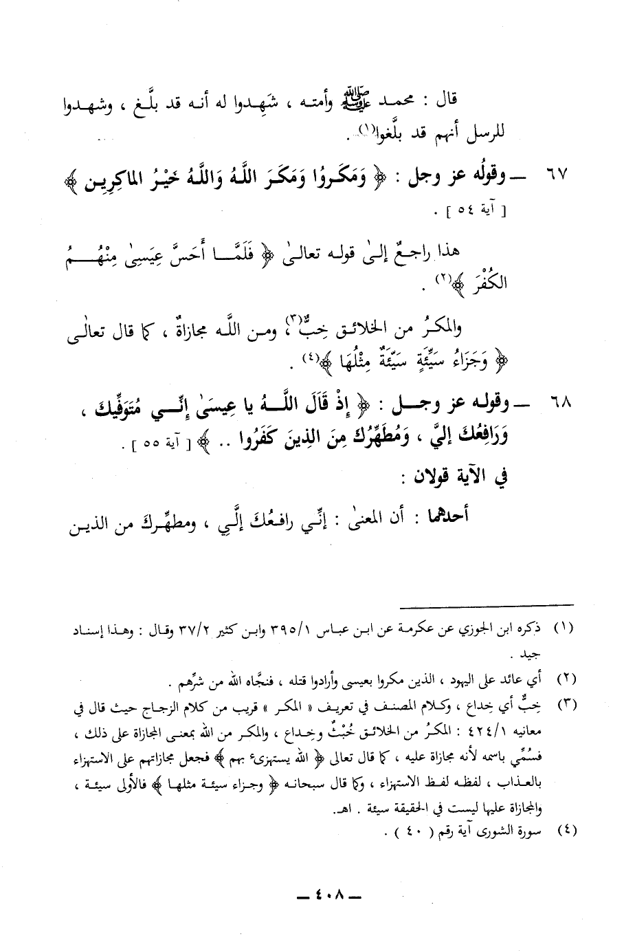 قال محمد صلى الله عليه وسلم وأمته شهدوا له انه قد بلغ وشهدوا للرسل انهم قد بلغوا 67 - وقوله عز وجل ومكروا ومكر الله والله خير الماكرين هذا راجع الى قوله تعالى فلما أحس عيسى منهم الكفر والمكر من الخلائق خب ومن الله مجازة كما قال تعالى وجزاء سيئة سيئة مثلها 68 - وقوله عز وجل إذ قال الله يا عيسى اني متوفيك ورافعك الي ومطهرك من الذين كفروا في الآية قولان احدهما ان المعنى أني رافعك ألي ومطهرك من الذين