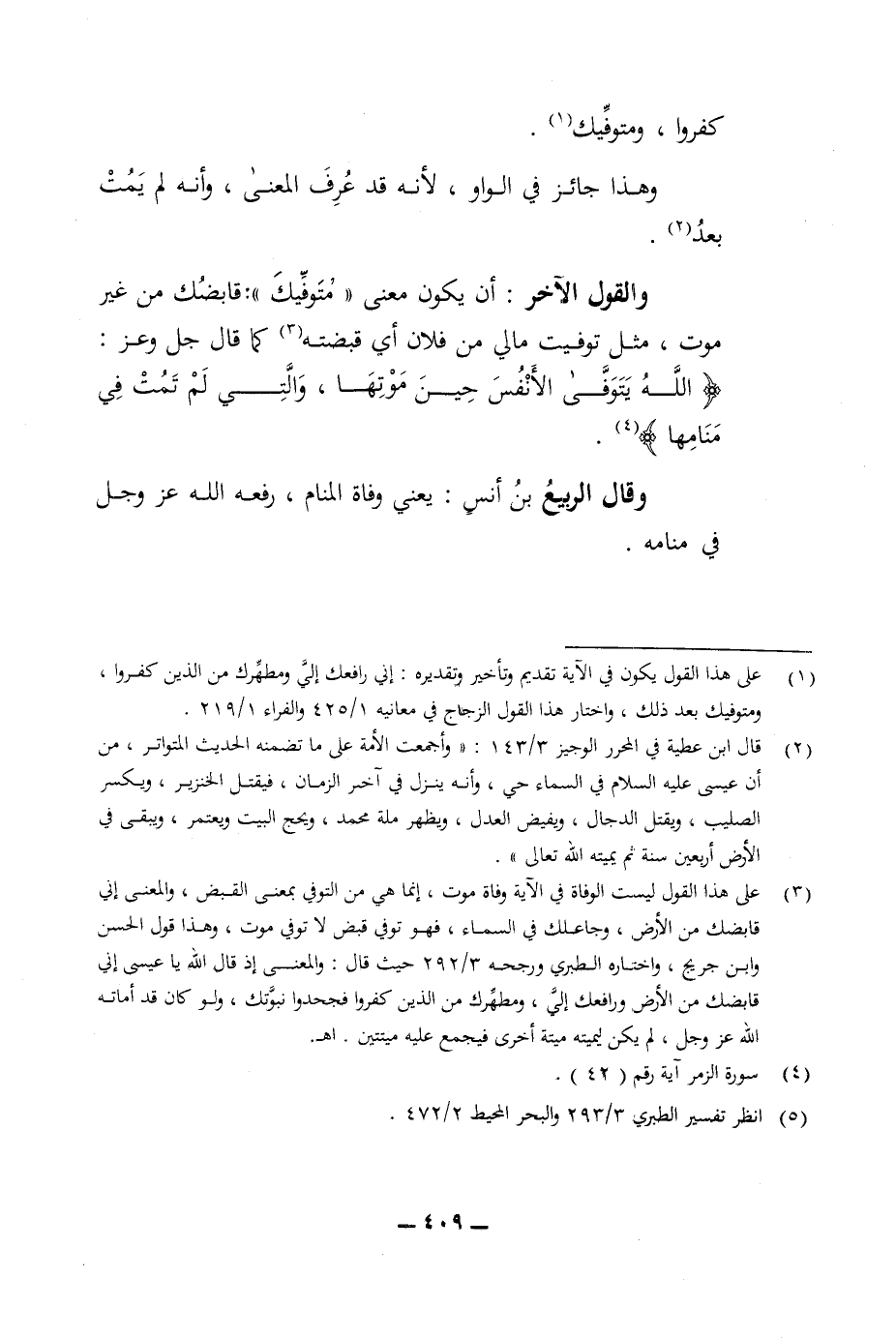 كفروا ومتوفيك وهذا جائز في الواو لانه قد عرف المعنى وانه لم يمت بعد والقول الاخر ان يكون معنى متوفيك قابضك من غير موت مثل توفيت مالي من فلان أي قبضته كما قال جل وعز الله يتوفى الانفس حين موتها والتي لم تمت في منامها وقال الربيع بن أنس يعني وفاة المنام رفعه الله عز وجل في منامه