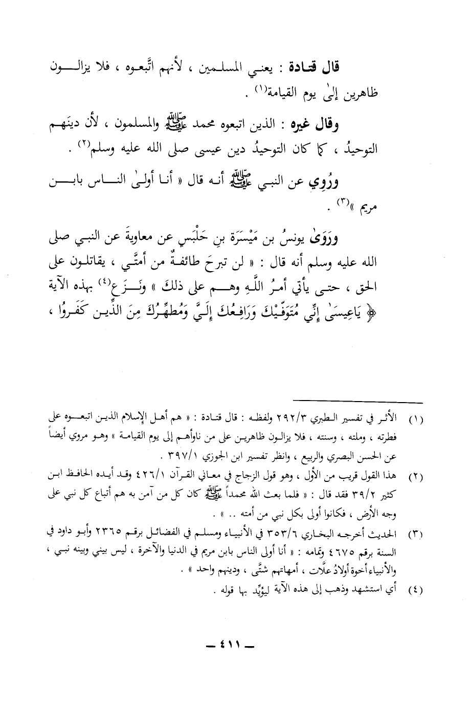 ظاهرين الى يوم القيامة وقال غيره الذين اتبعوه محمد صلى الله عليه وسلم والمسلمون لان دينهم التوحيد كما كان التوحيد دين عيسى صلى الله عليه وسلم وروي عن النبي صلى الله عليه وسلم انه قال أنا أولى الناس بابن مريم وروى يونس بن ميسرة بن حلبس عن معاوية عن النبي صلى الله عليه وسلم انه قال لن تبرح طائفة من أمتي يقاتلون على الحق حتى يأتي أمر الله وهم على ذلك ونزع بهذه الآية يا عيسى اني متوفيك ورافعك الي ومطهرك من الذين كفروا
