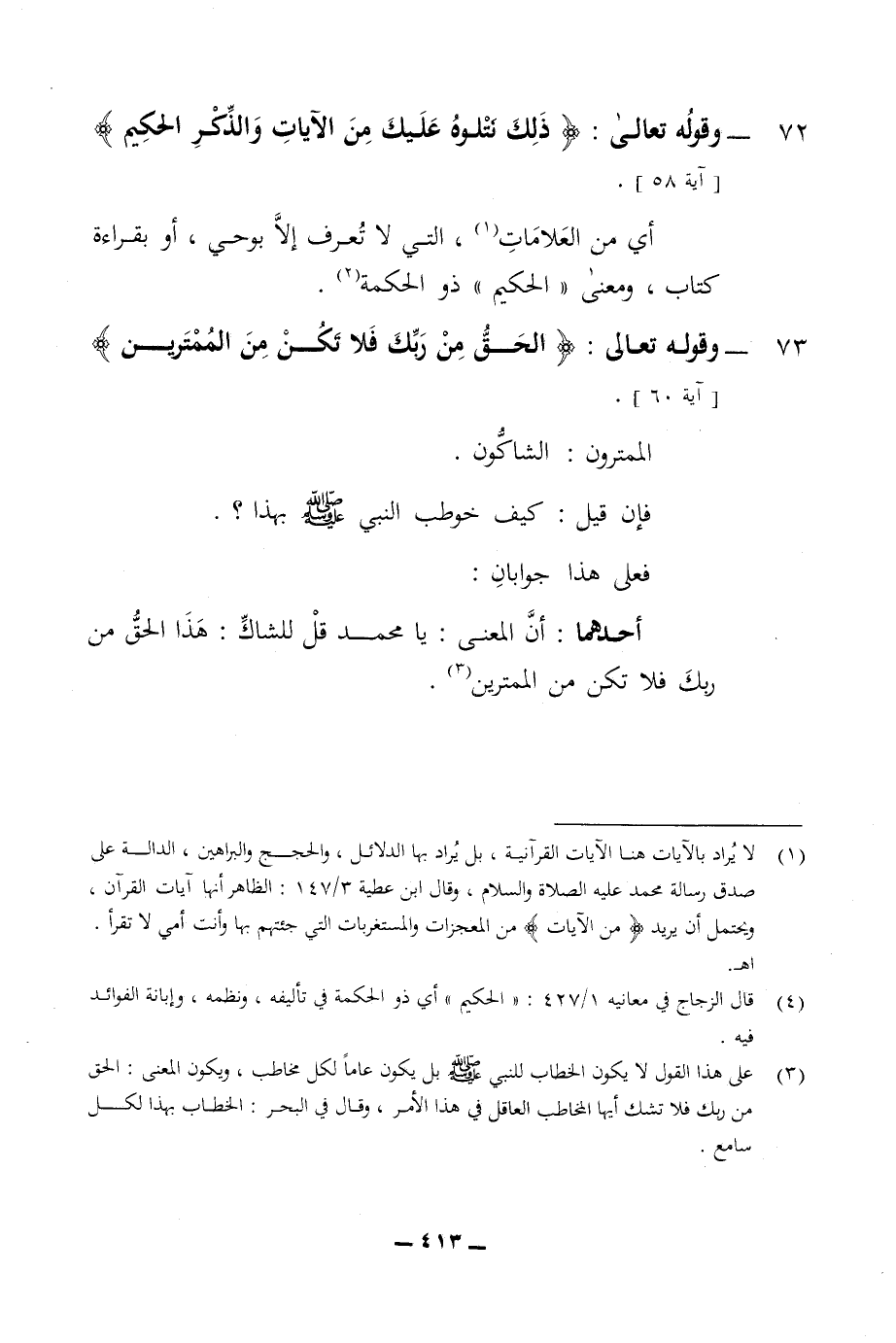 72 - وقوله تعالى ذلك نتلوه عليك من الايات والذكر الحكيم أي من العلامات التي لا تعرف الا بوحي أو بقراءة كتاب ومعنى الحكيم ذو الحكمة 73 - وقوله تعالى الحق من ربك فلا تكن من الممترين الممترون الشاكون فان قيل كيف خوطب النبي صلى الله عليه وسلم بهذا فعلى هذا جوابان أحدهما ان المعنى يا محمد قل للشاك هذا الحق من ربك فلا تكن من الممترين