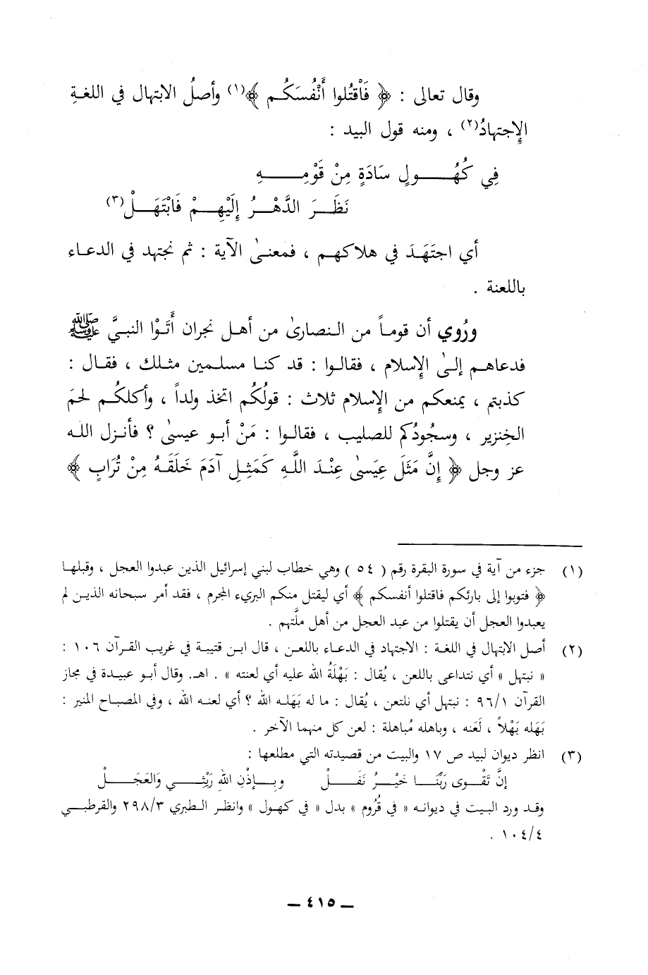 وقال تعالى فاقتلوا أنفسكم وأصل الابتهال في اللغة الاجتهاد ومنه قول البيد * في كهول سادة من قومه *