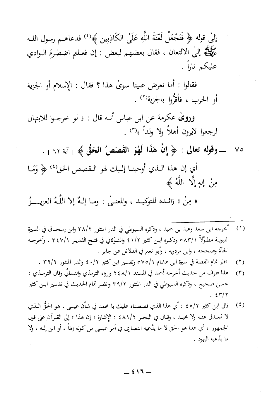 الى قوله تعالى فنجعل لعنة الله على الكاذبين فدعهم رسول الله صلى الله عليه وسلم الى الالتعان فقال بعضهم بعض ان فعلتم اضطرم الوادي عليكم نارا فقالوا أما تعرض علينا سوى هذا فقال الاسلام أو الجزية أو الحرب فأقروا بالجزية وروى عكرمة عن ابن عباس انه قال لو خرجوا للابتهال لرجعوا لا يرون أهلا ولا ولدا 75 - وقوله تعالى ان هذا لهو القصص الحق أي ان هذا الذي أوحينا اليك لهو القصص الحق وما من اله الا الله من زائدة للتوكيد والمعنى وما اله الا الله العزيز