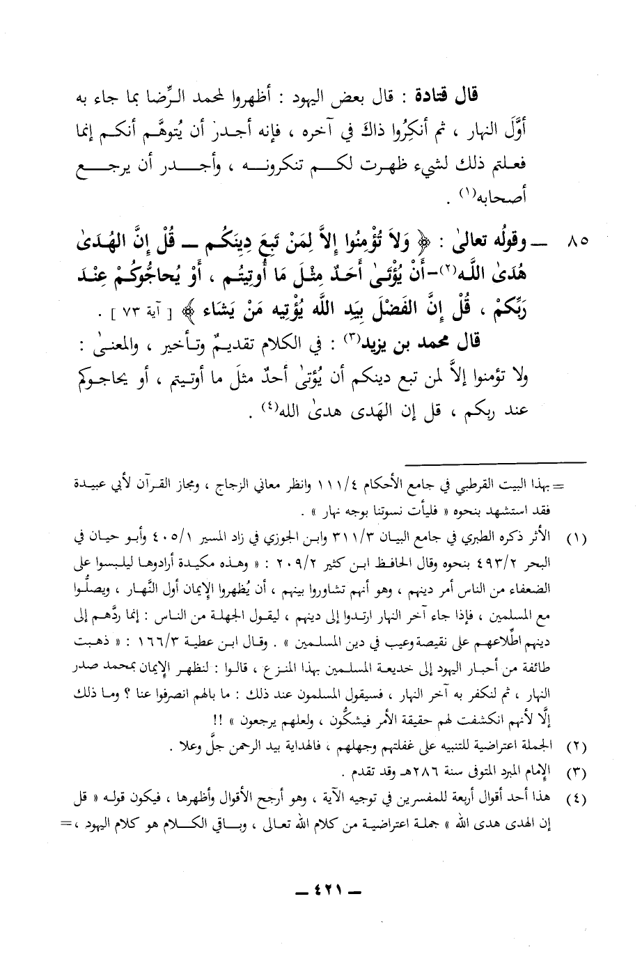 قال قتادة قال بعض اليهود أظهروا لمحمد الرضا ما بما جاء به أول انهار ثم انكروا ذاك في آخره فانه أجدر ان يتوهم انكم انما فعلتم ذلك لشئ ظهرت لكم تنكرونه وأجدر أن يرجع أصحابه 85 - وقوله تعالى ولا تؤمنوا الا لمن تبع دينكم قل ان الهدى هدى الله ان يؤتى أحد مثل ما أوتيتم أو يحاجوكم عند ربكم قل ان الفضل بيد الله يؤته من يشاء قال محمد بن يزيد في الكلام تقديم وتأخير والمعنى ولا تؤمنوا الا لمن تبع دينكم ان يؤتى أحد مثل ما أوتيتم أو يحاجوكم عند ربكم قل ان الهدى هدى الله