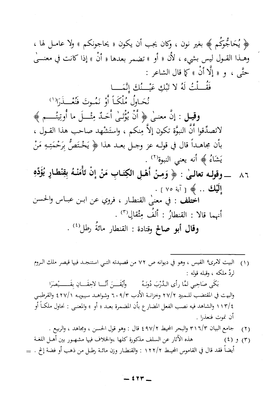 يحاجوكم بغير نون وكان يجب ان يكون يحاجونكم ولا عامل لها وهذا القول ليس بشئ لان أو تضمر بعدها ان إذا كانت في معنى حتى والاان كم قال الشاعر * فقلت له لا تبك عيناك انما * نحاول ملكا أو نموت فنعذرا * وقيل ان معنى أن يؤتى أحد مثل ما أوتيتم لا تصدقوا ان النبوة تكون الا منكم واستشهد صاحب هذا القول بأن مجاهدا قال في قوله عز وجل بعد هذا يختص برحمته من يشاء انه يعني النبوة 86 - وقوله تعالى ومن أهل الكتاب من ان تأمنه بقنطار يؤده اليك اختلف في معنى القنطار فروي عن ابن عباس والحسن أنهما قالا القنطار ألف مثقال وقال أبو صالح وقتادة القنطار مائة رطل