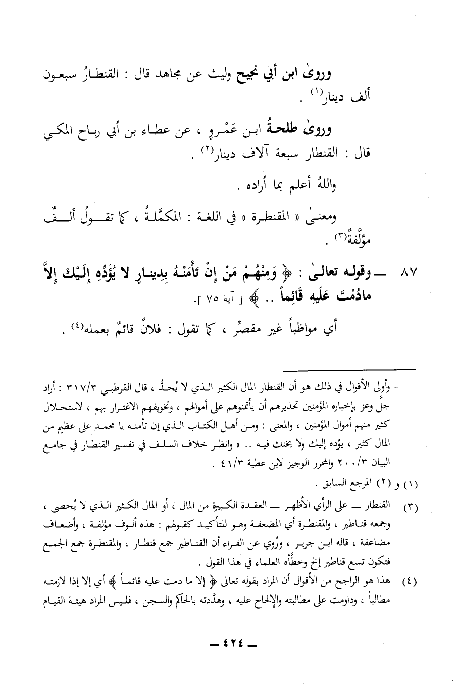 وروى ابن ابي نجيح وليث عن مجاهد قال القنطار سبعون ألف دينار وروى طلحة ابن عمرو عن عطاء بن ابي رباح المكي قال القنطار سبعة الاف دينار والله اعلم بما أراد ومعنى المقنطرة في اللغة المكملة كما تقول ألف