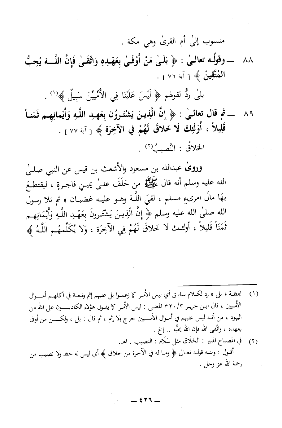 منسوب الى ام القرى وهي مكة 88 - وقوله تعالى بلى من اوفى بعهده واتقى فان الله يحب المتقين بلى رد لقولهم ليس علينا في الاميين سبيل 89 - ثم قال تعالى ان الذين يشترون بعهد الله وأيمانهم ثمنا قليلا أؤلئك لا خلاق لهم في الاخرة الخلاق النصيب