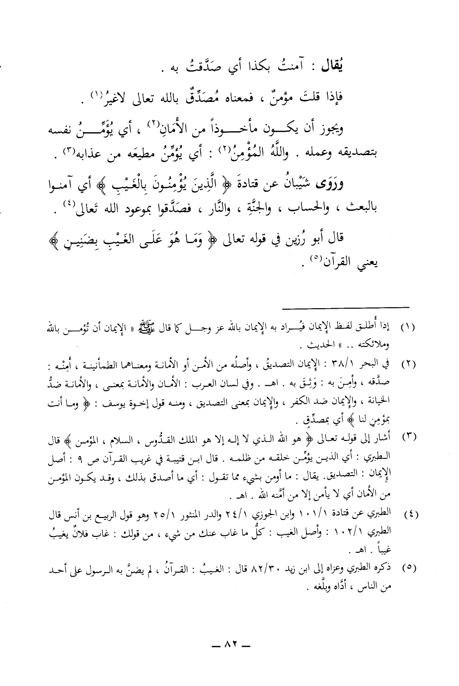 يقال آمنت بكذا أي صدقت به فإذا قلت مؤمن فمعناه مصدق بالله تعالى لا غير ويجوز ان يكون مأخوذا من الأمان أي يؤمن نفسه بتصديقه وعمله والله المؤمن أي يؤمن مطيعه من عذابه