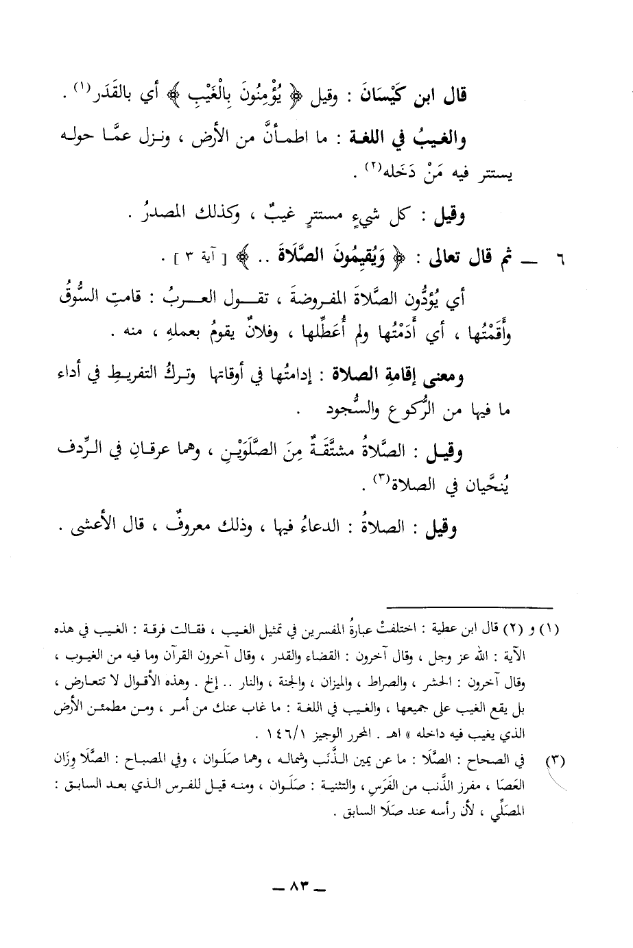 قال ابن كيسان وقيل يؤمنون بالغيب أي القدر والغيب في اللغة ما اطمأن من الارض ونزل عما حوله يستتر فيه من دخله وقيل كل شئ مستتر غيب وكذلك المصدر 6 - ثم قال تعالى ويقيمون الصلاة أي يؤدون الصلاة المفروضة تقول العرب قامت السوق وأقمتها أي أدمتها ولم أعطلها أحمد وفلان يقوم بعمله منه ومعنى إقامة الصلاة إدامتها في أوقاتها وترك التفريط في أداء ما فيها من الركوع والسجود وقيل الصلاة مشتقة من الصلوين وهما عرقان في الردف ينحيان في الصلاة وقيل الصلاة الدعاء فيها معروف قال الأعشى