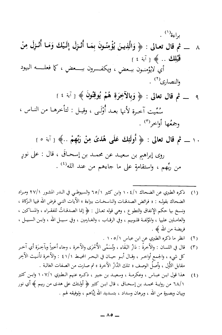 براءه 8 - ثم قال تعالى والذين يؤمنون بما انزل إليك وما انزل من قبلك أي لا يؤمنون ببعض ويكفرون ببعض كما فعله اليهود والنصارى 9 - ثم قال تعالى وبالآخرة هم يوقنون سميت آخره لانها بعد اولى وقيل لتأخرها من الناس وجمعها أواخر 10 - ثم قال تعالى أؤلئك على هدى من ربهم روى إبراهيم بن سعيد عن محمد بن إسحاق قال على نور من ربهم واستقامة على ما جاءهم من عند الله